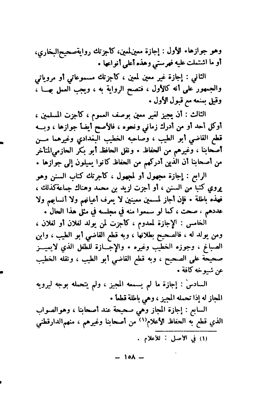 الرَّابِعُ: إِجَازَةُ مَجْهُولٍ أَوْ لِمَجْهُولٍ، كَأَجَزْتُكَ كِتَابَ السُّنَنِ وَهُوَ يَرْوِي كُتُبًا مِنَ السُّنَنِ، أَوْ أَجْزْتُ لِزَيْدِ بْنِ مُحَمَّدٍ وَهُنَاكَ جَمَاعَةٌ كَذَلِكَ، فَهَذِهِ بَاطِلَةٌ. فَإِنْ أَجَازَ لِمُسَمَّيْنَ مُعَيَّنِينَ لَا يَعْرِفُ أَعْيَانَهُمْ وَلَا أَنْسَابَهُمْ وَلَا عَدَدَهُمْ، صَحَّتْ، كَمَا لَوْ سَمِعُوا مِنْهُ فِي مَجْلِسِهِ فِي مِثْلِ هَذَا الْحَالِ.
