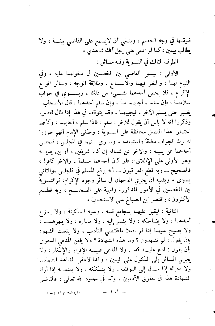الطَّرَفُ الثَّالِثُ فِي التَّسْوِيَةِ وَفِيهِ مَسَائِلُ: الْأُولَى: لِيُسَوِّ الْقَاضِي بَيْنَ الْخَصْمَيْنِ فِي دُخُولِهِمَا عَلَيْهِ، وَفِي الْقِيَامِ لَهُمَا، وَالنَّظَرِ فِيهِمَا وَالِاسْتِمَاعِ، وَطَلَاقَةِ الْوَجْهِ، وَسَائِرِ أَنْوَاعِ الْإِكْرَامِ، فَلَا يَخُصُّ أَحَدَهُمَا بِشَيْءٍ مِنْ ذَلِكَ، وَيُسَوِّي فِي جَوَابِ سَلَامِهِمَا، فَإِنْ سَلَّمَا، أَجَابَهُمَا مَعًا، وَإِنْ سَلَّمَ أَحَدُهُمَا، قَالَ الْأَصْحَابُ: يَصْبِرُ حَتَّى يُسَلِّمَ الْآخَرُ، فَيُجِيبَهُمَا: وَقَدْ يَتَوَقَّفُ فِي هَذَا إِذَا طَالَ الْفَصْلُ، وَذَكَرُوا أَنَّهُ لَا بَأْسَ أَنْ يَقُولَ لِلْآخَرِ: سَلِّمْ، فَإِذَا سَلَّمَ، أَجَابَهُمَا، وَكَأَنَّهُمُ احْتَمَلُوا هَذَا الْفَصْلَ مُحَافَظَةً عَلَى التَّسْوِيَةِ، وَحَكَى الْإِمَامُ أَنَّهُمْ جَوَّزُوا لَهُ تَرَكَ الْجَوَابِ مُطْلَقًا وَاسْتَبْعَدَهُ.