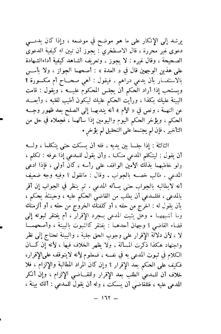 يُرْشِدُ إِلَى الْإِنْكَارِ عَلَى مَا هُوَ مُوَضَّحٌ فِي مَوْضِعِهِ، وَإِذَا كَانَ يَدَّعِي دَعْوَى غَيْرَ مُحَرَّرَةٍ، قَالَ الْإِصْطَخْرِيُّ: يَجُوزُ أَنْ تُبَيَّنَ لَهُ كَيْفِيَّةُ الدَّعْوَى الصَّحِيحَةِ، وَقَالَ غَيْرُهُ: لَا يَجُوزُ، وَتَعْرِيفُ الشَّاهِدِ كَيْفِيَّةَ أَدَاءِ الشَّهَادَةِ عَلَى هَذَيْنِ الْوَجْهَيْنِ قَالَ فِي الْعُدَّةِ: أَصَحُّهُمَا الْجَوَازُ، وَلَا بَأْسَ بِالِاسْتِفْسَارِ بِأَنْ يَدَّعِيَ دَرَاهِمَ، فَيَقُولُ: أَهِيَ صِحَاحٌ أَمْ مَكْسُورَةٌ؟ وَيُسْتَحَبُّ إِذَا أَرَادَ الْحُكْمَ أَنْ يُجْلِسَ الْمَحْكُومَ عَلَيْهِ، وَيَقُولَ: قَامَتِ الْبَيِّنَةُ عَلَيْكَ بِكَذَا، وَرَأَيْتُ الْحُكْمَ عَلَيْكَ. لِيَكُونَ أَطْيَبَ لِقَلْبِهِ، وَأَبْعَدَ عَنِ التُّهْمَةِ، وَنَصَّ فِي «الْأُمِّ» أَنَّهُ يَنْدُبُهُمَا إِلَى الصُّلْحِ بَعْدَ ظُهُورِ وَجْهِ الْحُكْمِ، وَيُؤَخِّرُ الْحُكْمَ الْيَوْمَ وَالْيَوْمَيْنِ إِذَا سَأَلَهُمَا، فَجَعَلَاهُ فِي حِلٍّ مِنَ التَّأْخِيرِ، فَإِنْ لَمْ يَجْتَمِعَا عَلَى التَّحْلِيلِ لَمْ يُؤَخِّرْ.