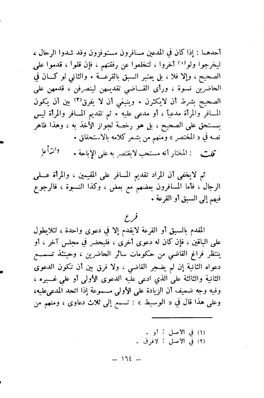 ثُمَّ لَا يَخْفَى أَنَّ الْمُرَادَ تَقْدِيمُ الْمُسَافِرِ عَلَى الْمُقِيمِينَ، وَالْمَرْأَةِ عَلَى الرِّجَالِ، فَأَمَّا الْمُسَافِرُونَ بَعْضُهُمْ مَعَ بَعْضٍ، وَكَذَا النِّسْوَةُ، فَالرُّجُوعُ فِيهِمْ إِلَى السَّبْقِ أَوِ الْقُرْعَةِ.