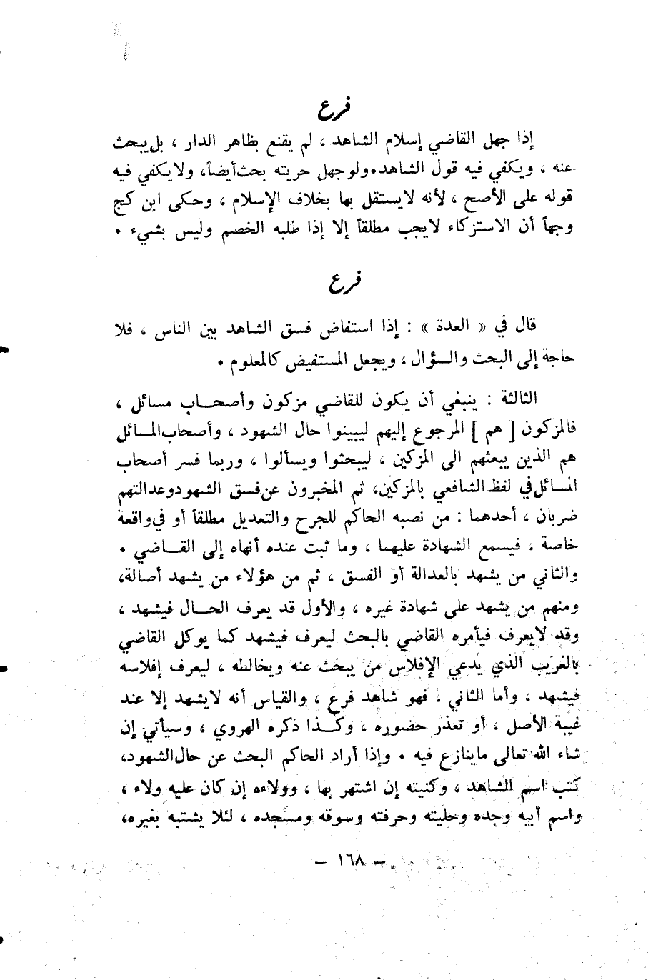 وَالثَّانِي مَنْ يَشْهَدُ بِالْعَدَالَةِ أَوِ الْفِسْقِ، ثُمَّ مِنْ هَؤُلَاءِ مَنْ يَشْهَدُ أَصَالَةً، وَمِنْهُمْ مَنْ يَشْهَدُ عَلَى شَهَادَةِ غَيْرِهِ، وَالْأَوَّلُ قَدْ يَعْرِفُ الْحَالَ فَيَشْهَدُ، وَقَدْ لَا يَعْرِفُ فَيَأْمُرُهُ الْقَاضِي بِالْبَحْثِ لِيَعْرِفَ فَيُشْهِدَ، كَمَا يُوَكِّلُ الْقَاضِي بِالْغَرِيبِ الَّذِي يَدَّعِي الْإِفْلَاسَ مَنْ يَبْحَثُ عَنْهُ وَيُخَالِطُهُ، لِيَعْرِفَ إِفْلَاسَهُ فَيَشْهَدَ، وَأَمَّا الثَّانِي، فَهُوَ شَاهِدُ فَرْعٍ، وَالْقِيَاسُ أَنَّهُ لَا يَشْهَدُ إِلَّا عِنْدَ غَيْبَةِ الْأَصْلِ، أَوْ تَعَذُّرِ حُضُورِهِ، وَكَذَا ذَكَرَهُ الْهَرَوِيُّ، وَسَيَأْتِي إِنْ شَاءَ اللَّهُ تَعَالَى مَا يُنَازَعُ فِيهِ. وَإِذَا أَرَادَ الْحَاكِمُ الْبَحْثَ عَنْ حَالِ الشُّهُودِ، كَتَبَ اسْمَ الشَّاهِدِ، وَكُنْيَتَهُ إِنِ اشْتَهَرَ بِهَا، وَوَلَاءَهُ إِنْ كَانَ عَلَيْهِ وَلَاءٌ، وَاسْمَ أَبِيهِ وَجَدِّهِ وَحِلْيَتَهُ وَحِرْفَتَهُ وَسُوقَهُ وَمَسْجِدَهُ، لِئَلَّا يُشْتَبَهُ بِغَيْرِهِ،