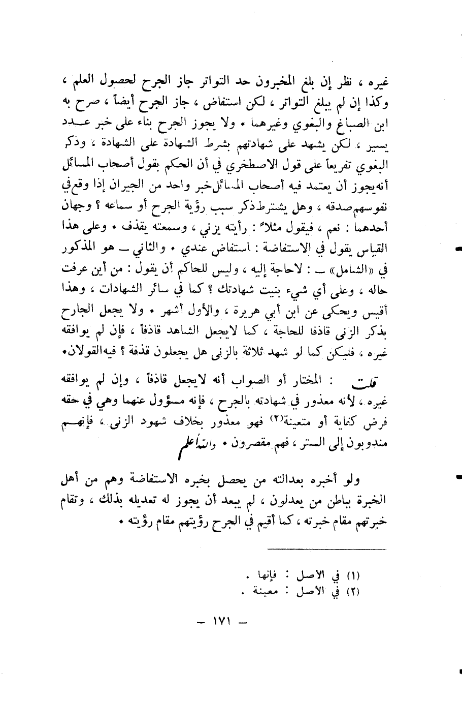 قُلْتُ: الْمُخْتَارُ أَوِ الصَّوَابُ أَنَّهُ لَا يُجْعَلُ قَاذِفًا، وَإِنْ لَمْ يُوَافِقْهُ غَيْرُهُ؛ لِأَنَّهُ مَعْذُورٌ فِي شَهَادَتِهِ بِالْجَرْحِ، فَإِنَّهُ مَسْئُولٌ عَنْهُمَا وَهِيَ فِي حَقِّهِ فَرْضُ كِفَايَةٍ أَوْ مُتَعَيَّنَةٌ فَهُوَ مَعْذُورٌ بِخِلَافِ شُهُودِ الزِّنَى، فَإِنَّهُمْ مَنْدُوبُونَ إِلَى السَّتْرِ، فَهُمْ مُقَصِّرُونَ، وَاللَّهُ أَعْلَمُ.