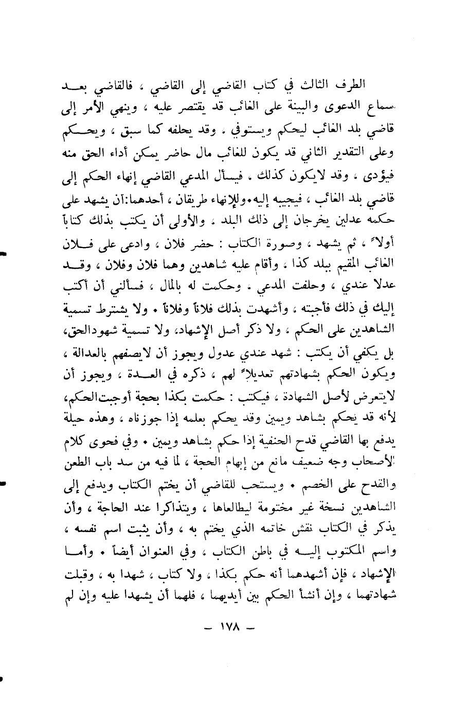 الطَّرَفُ الثَّالِثُ فِي كِتَابِ الْقَاضِي إِلَى الْقَاضِي، فَالْقَاضِي بَعْدَ سَمَاعِ الدَّعْوَى وَالْبَيِّنَةِ عَلَى الْغَائِبِ قَدْ يَقْتَصِرُ عَلَيْهِ، وَيُنْهِي الْأَمْرَ إِلَى قَاضِي بَلَدِ الْغَائِبِ لِيَحْكُمَ وَيَسْتَوْفِيَ، وَقَدْ يُحَلِّفُهُ كَمَا سَبَقَ، وَيَحْكُمُ وَعَلَى التَّقْدِيرِ الثَّانِي قَدْ يَكُونُ لِلْغَائِبِ مَالٌ حَاضِرٌ يُمْكِنُ أَدَاءُ الْحَقِّ مِنْهُ فَيُؤَدَّى، وَقَدْ لَا يَكُونُ كَذَلِكَ، فَيَسْأَلُ الْمُدَّعِي الْقَاضِيَ إِنْهَاءَ الْحُكْمِ إِلَى قَاضِي بَلَدِ الْغَائِبِ، فَيُجِيبُهُ إِلَيْهِ.