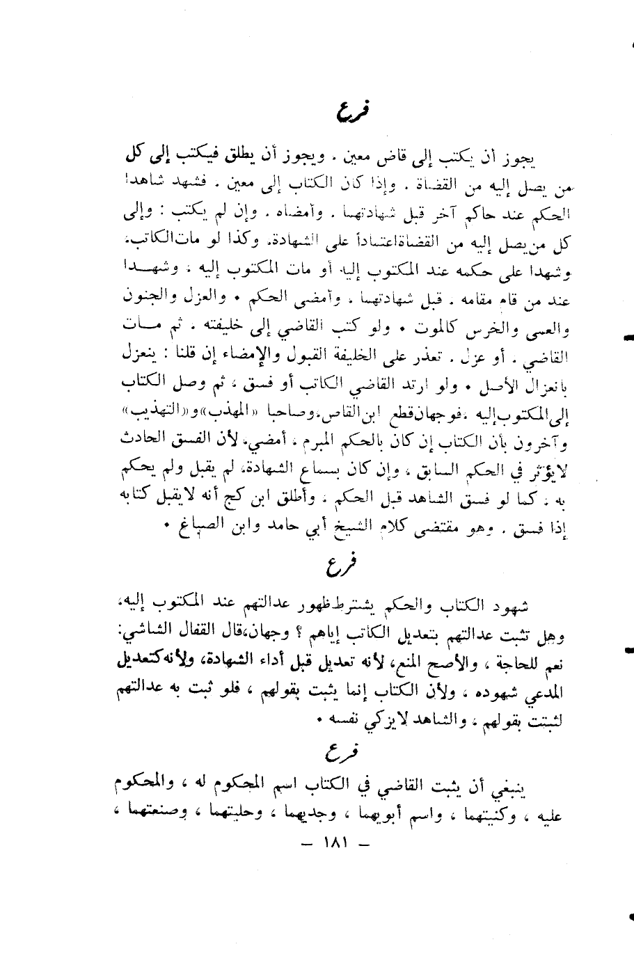 يَجُوزُ أَنْ يَكْتُبَ إِلَى قَاضٍ مُعَيَّنٍ، وَيَجُوزُ أَنْ يُطْلِقَ فَيَكْتُبَ إِلَى كُلِّ مَنْ يَصِلُ إِلَيْهِ مِنَ الْقُضَاةِ، وَإِذَا كَانَ الْكِتَابُ إِلَى مُعَيَّنٍ، فَشَهِدَ شَاهِدَا الْحُكْمِ عِنْدَ حَاكِمٍ آخَرَ، قَبِلَ شَهَادَتَهُمَا وَأَمْضَاهُ، وَإِنْ لَمْ يَكْتُبْ: وَإِلَى كُلِّ مَنْ يَصِلُ إِلَيْهِ مِنَ الْقُضَاةِ؛ اعْتِمَادًا عَلَى الشَّهَادَةِ، وَكَذَا لَوْ مَاتَ الْكَاتِبُ وَشَهِدَا عَلَى حُكْمِهِ عِنْدَ الْمَكْتُوبِ إِلَيْهِ أَوْ مَاتَ الْمَكْتُوبُ إِلَيْهِ، وَشَهِدَا عِنْدَ مَنْ قَامَ مَقَامَهُ، قَبِلَ شَهَادَتَهُمَا، وَأَمْضَى الْحُكْمَ.