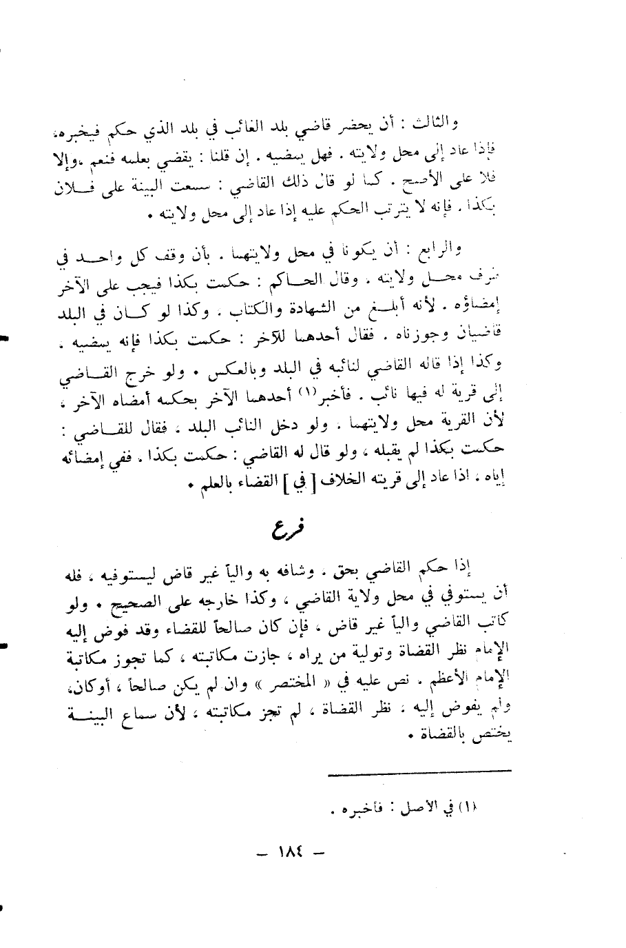 وَالرَّابِعُ: أَنْ يَكُونَا فِي مَحَلِّ وِلَايَتِهِمَا، بِأَنْ وَقَفَ كُلُّ وَاحِدٍ فِي طَرَفِ مَحَلِّ وِلَايَتِهِ، وَقَالَ الْحَاكِمُ: حَكَمْتُ بِكَذَا فَيَجِبُ عَلَى الْآخَرِ إِمْضَاؤُهُ؛ لِأَنَّهُ أَبْلَغُ مِنَ الشَّهَادَةِ وَالْكِتَابِ، وَكَذَا لَوْ كَانَ فِي الْبَلَدِ قَاضِيَانِ وَجَوَّزْنَاهُ، فَقَالَ أَحَدُهُمَا لِلْآخَرِ: حَكَمْتُ بِكَذَا فَإِنَّهُ يُمْضِيهِ، وَكَذَا إِذَا قَالَهُ الْقَاضِي لِنَائِبِهِ فِي الْبَلَدِ وَبِالْعَكْسِ.