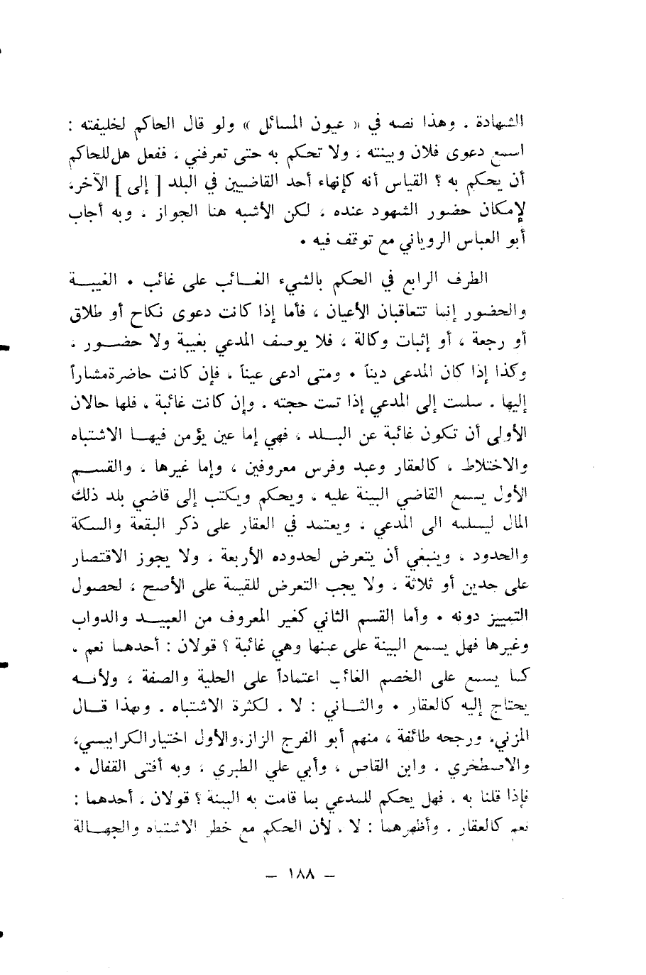 الطَّرَفُ الرَّابِعُ فِي الْحُكْمِ بِالشَّيْءِ الْغَائِبِ عَلَى غَائِبٍ. الْغَيْبَةُ وَالْحُضُورُ إِنَّمَا تَتَعَاقَبَانِ الْأَعْيَانَ، فَأَمَّا إِذَا كَانَتْ دَعْوَى نِكَاحٍ أَوْ طَلَاقٍ أَوْ رَجْعَةٍ، أَوْ إِثْبَاتِ وِكَالَةٍ، فَلَا يُوصَفُ الْمُدَّعِي بِغَيْبَةٍ وَلَا حُضُورٍ، وَكَذَا إِذَا كَانَ الْمُدَّعَى دَيْنًا.