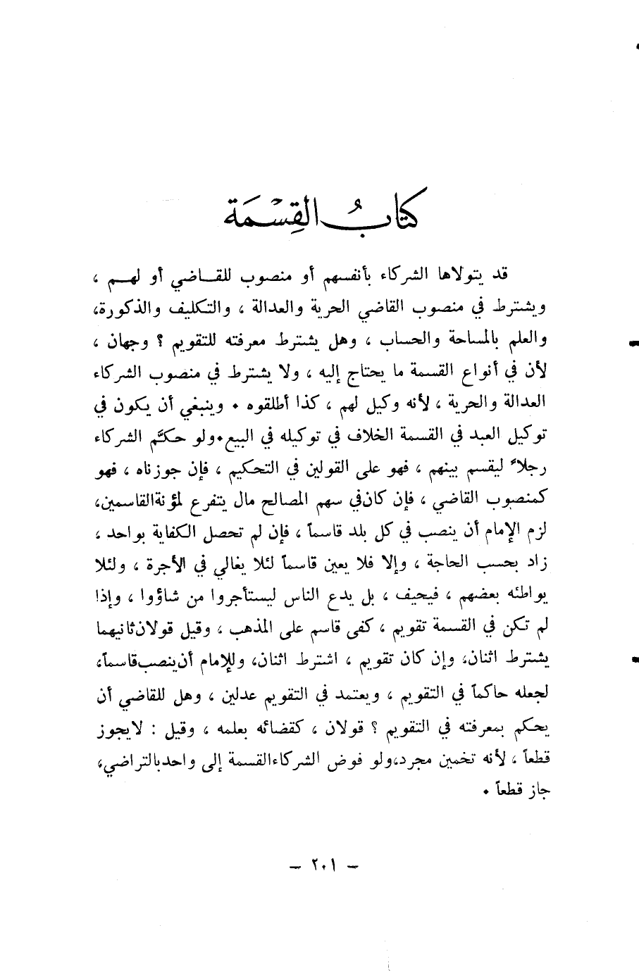 قَدْ يَتَوَلَّاهَا الشُّرَكَاءُ بِأَنْفُسِهِمْ أَوْ مَنْصُوبٌ لِلْقَاضِي أَوْ لَهُمْ، وَيُشْتَرَطُ فِي مَنْصُوبِ الْقَاضِي الْحُرِّيَّةُ وَالْعَدَالَةُ، وَالتَّكْلِيفُ وَالذُّكُورَةُ، وَالْعِلْمُ بِالْمِسَاحَةِ وَالْحِسَابِ، وَهَلْ يُشْتَرَطُ مَعْرِفَتُهُ لِلتَّقْوِيمِ؟ وَجْهَانِ؛ لِأَنَّ فِي أَنْوَاعِ الْقِسْمَةِ مَا يَحْتَاجُ إِلَيْهِ، وَلَا يُشْتَرَطُ فِي مَنْصُوبِ الشُّرَكَاءِ الْعَدَالَةُ وَالْحُرِّيَّةُ؛ لِأَنَّهُ وَكِيلٌ لَهُمْ، كَذَا أَطْلَقُوهُ. وَيَنْبَغِي أَنْ يَكُونَ فِي تَوْكِيلِ الْعَبْدِ فِي الْقِسْمَةِ الْخِلَافُ فِي تَوْكِيلِهِ فِي الْبَيْعِ.