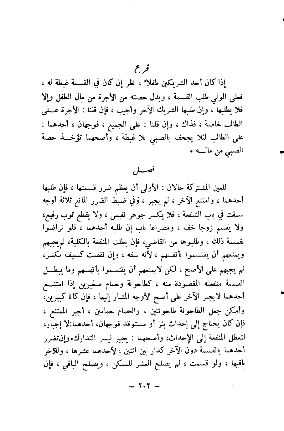لِلْعَيْنِ الْمُشْتَرَكَةِ حَالَانِ: الْأُولَى أَنْ يَعْظُمَ ضَرَرُ قِسْمَتِهَا، فَإِنْ طَلَبَهَا أَحَدُهُمَا، وَامْتَنَعَ الْآخَرُ، لَمْ يُجْبَرْ، وَفِي ضَبْطِ الضَّرَرِ الْمَانِعِ ثَلَاثَةُ أَوْجُهٍ سَبَقَتْ فِي بَابِ الشُّفْعَةِ، فَلَا يُكْسَرُ جَوْهَرٌ نَفِيسٌ، وَلَا يُقْطَعُ ثَوْبٌ رَفِيعٌ، وَلَا يُقْسَمُ زَوْجَا خُفٍّ، وَمِصْرَاعَا بَابٍ إِنْ طَلَبَهُ أَحَدُهُمَا، فَلَوْ تَرَاضَوْا بِقِسْمَةِ ذَلِكَ، وَطَلَبُوهَا مِنَ الْقَاضِي، فَإِنْ بَطَلَتِ الْمَنْفَعَةُ بِالْكُلِّيَّةِ، لَمْ يُجِبْهُمْ، وَيَمْنَعُهُمْ أَنْ يَقْتَسِمُوا بِأَنْفُسِهِمْ؛ لِأَنَّهُ سَفَهٌ، وَإِنْ نَقَصَتْ كَسَيْفٍ يُكْسَرُ، لَمْ يُجِبْهُمْ عَلَى الْأَصَحِّ، لَكِنْ لَا يَمْنَعُهُمْ أَنْ يَقْتَسِمُوا بِأَنْفُسِهِمْ وَمَا يُبْطِلُ الْقِسْمَةَ مَنْفَعَتُهُ الْمَقْصُودَةُ مِنْهُ، كَطَاحُونَةٍ وَحَمَّامٍ صَغِيرَيْنِ إِذَا امْتَنَعَ أَحَدُهُمَا لَا يُجْبَرُ الْآخَرُ عَلَى أَصَحِّ الْأَوْجُهِ الْمُشَارِ إِلَيْهَا.