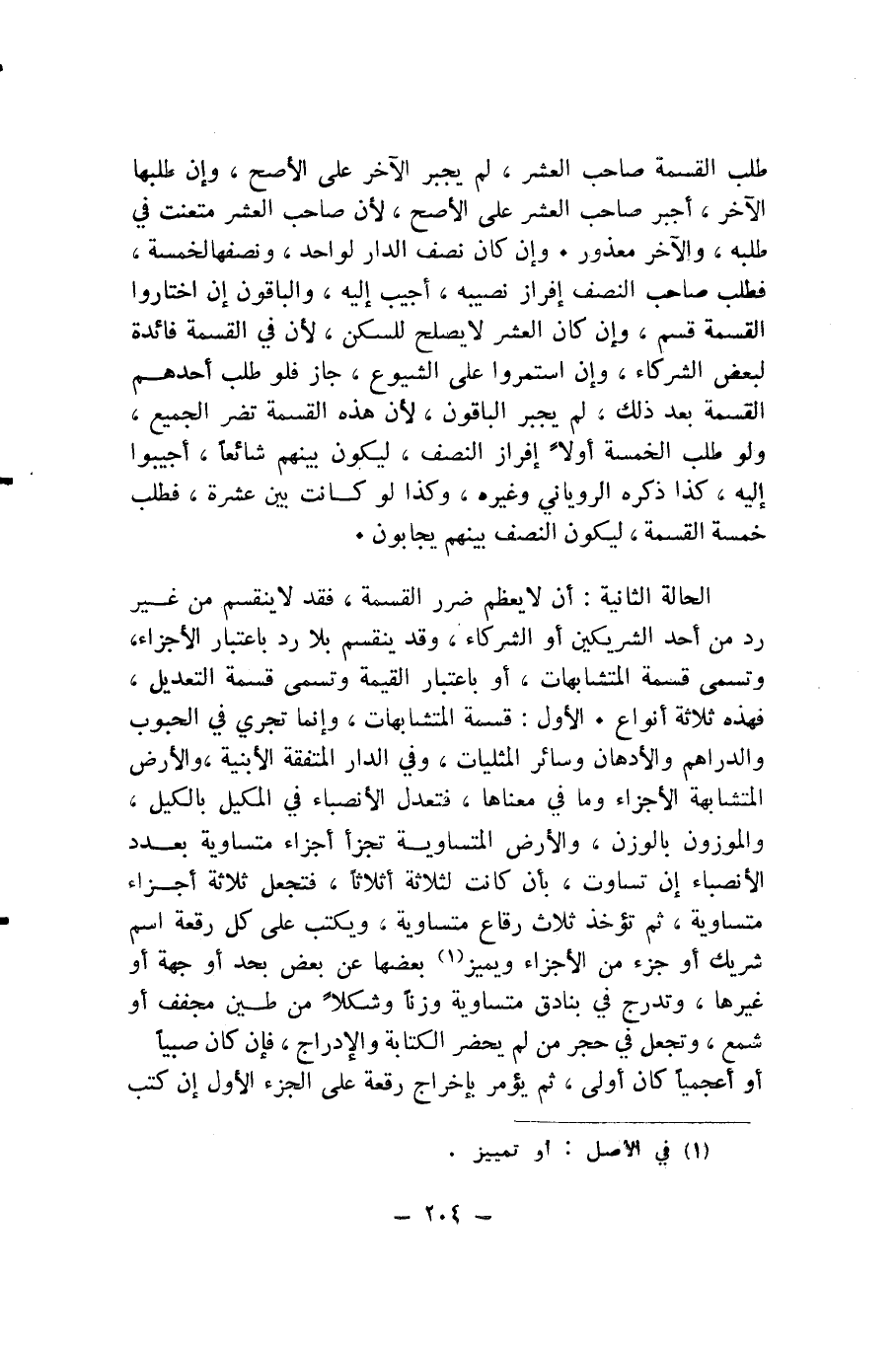 الْحَالَةُ الثَّانِيَةُ: أَنْ لَا يَعْظُمَ ضَرَرُ الْقِسْمَةِ، فَقَدْ لَا يَنْقَسِمُ مِنْ غَيْرِ رَدٍّ مَنْ أَحَدِ الشَّرِيكَيْنِ أَوِ الشُّرَكَاءِ، وَقَدْ يَنْقَسِمُ بِلَا رَدٍّ بِاعْتِبَارِ الْأَجْزَاءِ، وَتُسَمَّى قِسْمَةَ الْمُتَشَابِهَاتِ، أَوْ بِاعْتِبَارِ الْقِيمَةِ وَتُسَمَّى قِسْمَةَ التَّعْدِيلِ، فَهَذِهِ ثَلَاثَةُ أَنْوَاعٍ. الْأَوَّلُ: قِسْمَةُ الْمُتَشَابِهَاتِ، وَإِنَّمَا تَجْرِي فِي الْحُبُوبِ وَالدَّرَاهِمِ وَالْأَدْهَانِ وَسَائِرِ الْمِثْلِيَّاتِ، وَفِي الدَّارِ الْمُتَّفِقَةِ الْأَبْنِيَةِ، وَالْأَرْضِ الْمُتَشَابِهَةِ الْأَجْزَاءَ وَمَا فِي مَعْنَاهَا، فَتُعْدَلُ الْأَنْصِبَاءُ فِي الْمَكِيلِ بِالْكَيْلِ، وَالْمَوْزُونِ بِالْوَزْنِ، وَالْأَرْضُ الْمُتَسَاوِيَةُ تُجَزَّأُ أَجْزَاءً مُتَسَاوِيَةً بِعَدَدِ الْأَنْصِبَاءِ إِنْ تَسَاوَتْ، بِأَنْ كَانَتْ لِثَلَاثَةٍ أَثْلَاثًا، فَتُجْعَلُ ثَلَاثَةَ أَجْزَاءٍ مُتَسَاوِيَةٍ، ثُمَّ تُؤْخَذُ ثَلَاثُ رِقَاعٍ مُتَسَاوِيَةٍ، وَيُكْتَبُ عَلَى كُلِّ رُقْعَةٍ اسْمُ شَرِيكٍ أَوْ جُزْءٌ مِنَ الْأَجْزَاءِ وَيُمَيَّزُ بَعْضُهَا عَنْ بَعْضٍ بِحَدٍّ أَوْ جِهَةٍ أَوْ غَيْرِهَا، وَتُدْرَجُ فِي بَنَادِقَ مُتَسَاوِيَةٍ وَزْنًا وَشَكْلًا مَنْ طِينٍ مُجَفَّفٍ أَوْ شَمْعٍ، وَتُجْعَلُ فِي حَجْرِ مِنْ لَمْ يَحْضُرِ الْكِتَابَةَ وَالْإِدْرَاجَ، فَإِنْ كَانَ صَبِيًّا أَوْ أَعْجَمِيًّا كَانَ أَوْلَى، ثُمَّ يُؤْمَرُ بِإِخْرَاجِ رُقْعَةٍ عَلَى الْجُزْءِ الْأَوَّلِ إِنْ كُتِبَ