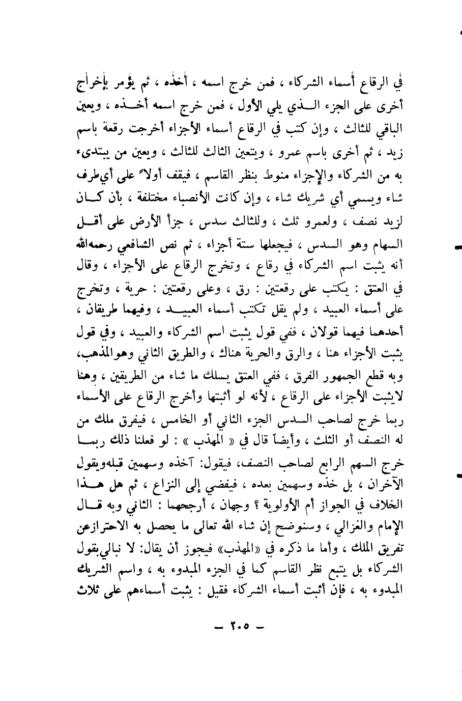 وَإِنْ كُتِبَ فِي الرِّقَاعِ أَسْمَاءُ الْأَجْزَاءِ أُخْرِجَتْ رُقْعَةٌ بَاسِمِ زَيْدٍ، ثُمَّ أُخْرَى بَاسِمِ عَمْرٍو، وَيُتَعَيَّنُ الثَّالِثُ لِلثَّالِثِ، وَيُعَيَّنُ مَنْ يُبْتَدِئُ بِهِ مِنَ الشُّرَكَاءِ وَالْإِجْزَاءِ مَنُوطٌ بِنَظَرِ الْقَاسِمِ، فَيَقِفُ أَوَّلًا عَلَى أَيِّ طَرَفٍ شَاءَ وَيُسَمِّي أَيَّ شَرِيكٍ شَاءَ، وَإِنْ كَانَتِ الْأَنْصِبَاءُ مُخْتَلِفَةً، بِأَنْ كَانَ لِزَيْدٍ نِصْفٌ، وَلِعَمْرٍو ثُلُثٌ، وَلِلثَّالِثِ سُدُسٌ، جَزَّأَ الْأَرْضَ عَلَى أَقَلِّ السِّهَامِ وَهُوَ السُّدُسُ، فَيَجْعَلُهَا سِتَّةَ أَجْزَاءٍ، ثُمَّ نَصَّ الشَّافِعِيُّ - رَحِمَهُ اللَّهُ - أَنَّهُ يُثْبِتَ اسْمَ الشُّرَكَاءِ فِي رِقَاعٍ، وَتَخْرُجُ الرِّقَاعُ عَلَى الْأَجْزَاءِ، وَقَالَ فِي الْعِتْقِ: يُكْتَبُ عَلَى رُقْعَتَيْنِ: رِقٌّ، وَعَلَى رُقْعَتَيْنِ: حُرِّيَّةٌ، وَتَخْرُجُ عَلَى أَسْمَاءِ الْعَبِيدِ، وَلَمْ يَقُلْ تُكْتَبُ أَسْمَاءُ الْعَبِيدِ، وَفِيهِمَا طَرِيقَانِ: