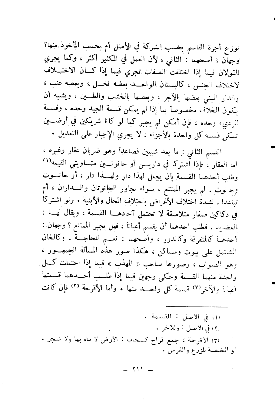 الْقِسْمُ الثَّانِي: مَا يُعَدُّ شَيْئَيْنِ فَصَاعِدًا وَهُوَ ضَرْبَانِ عَقَارٌ وَغَيْرُهُ، أَمَّا الْعَقَارُ، فَإِذَا اشْتَرَكَا فِي دَارَيْنِ أَوْ حَانُوتَيْنِ مُتَسَاوِيَتَيِ الْقِيمَةِ وَطَلَبَ أَحَدُهُمَا الْقِسْمَةَ بِأَنْ يُجْعَلَ لِهَذَا دَارٌ وَلِهَذَا دَارٌ، أَوْ حَانُوتٌ وَحَانُوتٌ، لَمْ يُجْبَرِ الْمُمْتَنِعُ، سَوَاءٌ تَجَاوَرَ الْحَانُوتَانِ وَالدَّارَانِ، أَمْ تَبَاعَدَا، لِشِدَّةِ اخْتِلَافِ الْأَغْرَاضِ بِاخْتِلَافِ الْمَحَالِّ وَالْأَبْنِيَةِ.