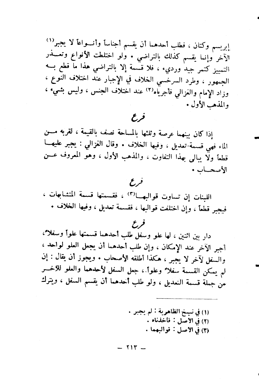 إِذَا كَانَ بَيْنَهُمَا عَرْصَةٌ وَثُلُثُهَا بِالْمِسَاحَةِ نَصِفٌ بِالْقِيمَةِ، لِقُرْبِهِ مِنَ الْمَاءِ فَهِيَ قِسْمَةُ تَعْدِيلٍ، وَفِيهَا الْخِلَافُ. وَقَالَ الْغَزَالِيُّ: يُجْبَرُ عَلَيْهَا قَطْعًا وَلَا يُبَالِي بِهَذَا التَّفَاوُتِ، وَالْمَذْهَبُ الْأَوَّلُ، وَهُوَ الْمَعْرُوفُ عَنِ الْأَصْحَابِ.