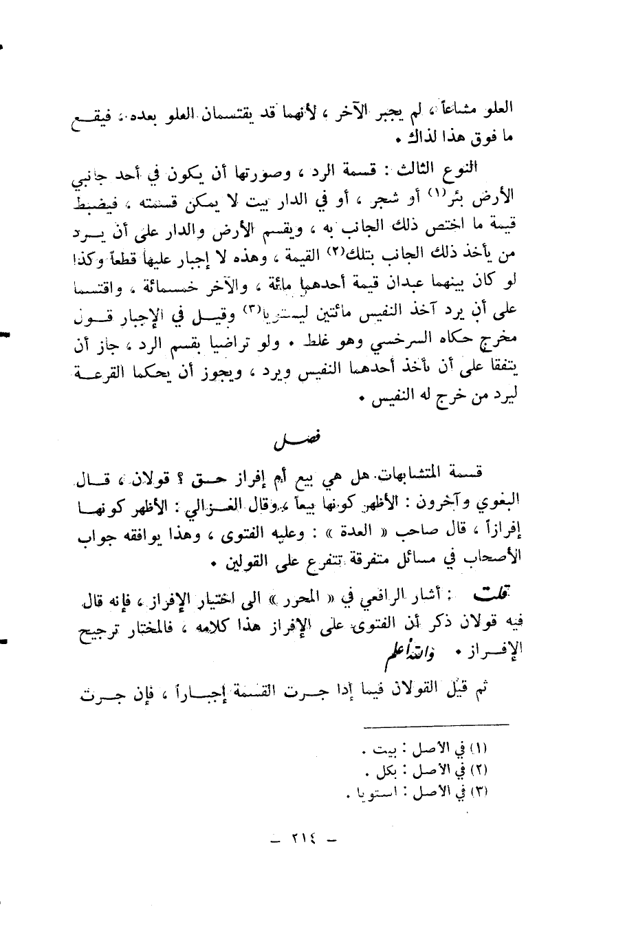النَّوْعُ الثَّالِثُ: قِسْمَةُ الرَّدِّ، وَصُورَتُهَا أَنْ يَكُونَ فِي أَحَدِ جَانِبَيِ الْأَرْضِ بِئْرٌ أَوْ شَجَرٌ، أَوْ فِي الدَّارِ بَيْتٌ لَا يُمْكِنُ قِسْمَتُهُ، فَيَضْبِطُ قِيمَةَ مَا اخْتُصَّ ذَلِكَ الْجَانِبُ بِهِ، وَيَقْسِمُ الْأَرْضَ وَالدَّارَ عَلَى أَنْ يَرُدَّ مَنْ يَأْخُذُ ذَلِكَ الْجَانِبَ بِتِلْكَ الْقِيمَةِ، وَهَذِهِ لَا إِجْبَارَ عَلَيْهَا قَطْعًا وَكَذَا لَوْ كَانَ بَيْنَهُمَا عَبْدَانِ قِيمَةُ أَحَدِهِمَا مِائَةٌ، وَالْآخِرُ خَمْسُمِائَةٍ، وَاقْتَسَمَا عَلَى أَنْ يَرُدَّ آخِذُ النَّفِيسِ مِائَتَيْنِ لِيَسْتَوِيَا وَقِيلَ فِي الْإِجْبَارِ قَوْلٌ مُخْرِجٌ حَكَاهُ السَّرَخْسِيُّ وَهُوَ غَلَطٌ. وَلَوْ تَرَاضَيَا بِقَسْمِ الرَّدِّ، جَازَ أَنْ يَتَّفِقَا عَلَى أَنْ يَأْخُذَ أَحَدُهُمَا النَّفِيسَ وَيَرُدَّ، وَيَجُوزُ أَنْ يُحَكِّمَا الْقُرْعَةَ لِيَرُدَّ مَنْ خَرَجَ لَهُ النَّفِيسُ.
