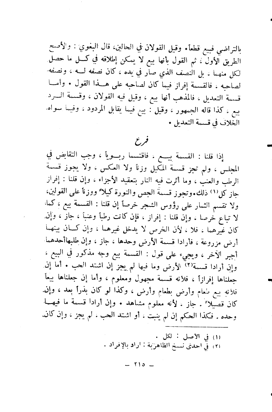 بِالتَّرَاضِي فَبِيعَ قَطْعًا. وَقِيلَ الْقَوْلَانِ فِي الْحَالَيْنِ، قَالَ الْبَغَوِيُّ: وَالْأَصَحُّ الطَّرِيقُ الْأَوَّلُ، ثُمَّ الْقَوْلُ بِأَنَّهَا بَيْعٌ لَا يُمْكِنُ إِطْلَاقُهُ فِي كُلِّ مَا حَصَلَ لِكُلٍّ مِنْهُمَا، بَلِ النِّصْفُ الَّذِي صَارَ فِي يَدِهِ، كَانَ نِصْفُهُ لَهُ، وَنِصْفُهُ لِصَاحِبِهِ، فَالْقِسْمَةُ إِفْرَازٌ فِيمَا كَانَ لِصَاحِبِهِ عَلَى هَذَا الْقَوْلِ. وَأَمَّا قِسْمَةُ التَّعْدِيلِ، فَالْمَذْهَبُ أَنَّهَا بِيعٌ، وَقِيلَ فِيهِ الْقَوْلَانِ، وَقِسْمَةُ الرَّدِّ بَيْعٌ، كَذَا قَالَهُ الْجُمْهُورُ، وَقِيلَ: بَيْعٌ فِيمَا يُقَابِلُ الْمَرْدُودَ، وَفِيمَا سِوَاهُ الْخِلَافُ فِي قِسْمَةِ التَّعْدِيلِ.