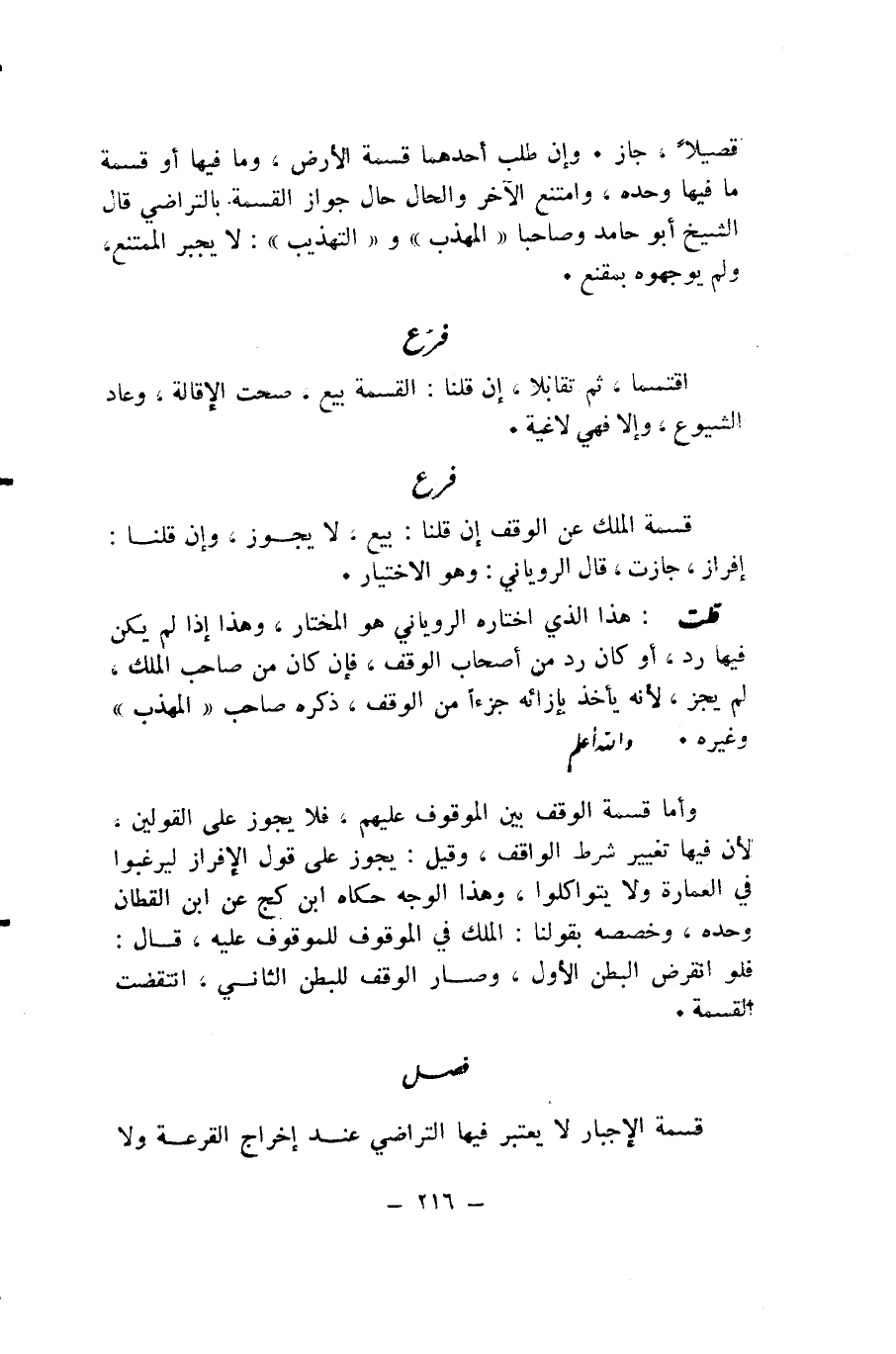 قَصِيلًا، جَازَ. وَإِنْ طَلَبَ أَحَدُهُمَا قِسْمَةَ الْأَرْضِ، وَمَا فِيهَا أَوْ قِسْمَةَ مَا فِيهَا وَحْدَهُ، وَامْتَنَعَ الْآخَرُ وَالْحَالُ حَالُ جَوَازِ الْقِسْمَةِ بِالتَّرَاضِي، قَالَ الشَّيْخُ أَبُو حَامِدٍ وَصَاحِبَا «الْمُهَذَّبِ» وَ «التَّهْذِيبِ» : لَا يُجْبَرُ الْمُمْتَنِعُ، وَلَمْ يُوَجِّهُوهُ بِمُقْنِعٍ.
