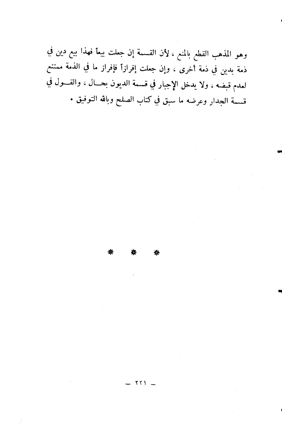 وَهُوَ الْمَذْهَبُ الْقَطْعُ بِالْمَنْعِ؛ لِأَنَّ الْقِسْمَةَ إِنْ جُعِلَتْ بَيْعًا فَهَذَا بَيْعُ دَيْنٍ فِي ذِمَّةٍ بِدَيْنٍ فِي ذِمَّةٍ أُخْرَى، وَإِنْ جُعِلَتْ إِفْرَازًا فَإِفْرَازُ مَا فِي الذِّمَّةِ مُمْتَنِعٌ لِعَدَمِ قَبْضِهِ، وَلَا يَدْخُلُ الْإِجْبَارُ فِي قِسْمَةِ الدُّيُونِ بِحَالٍ، وَالْقَوْلُ فِي قِسْمَةِ الْجِدَارِ وَعَرْضِهِ مَا سَبَقَ فِي كِتَابِ الصُّلْحِ. وَبِاللَّهِ التَّوْفِيقُ.