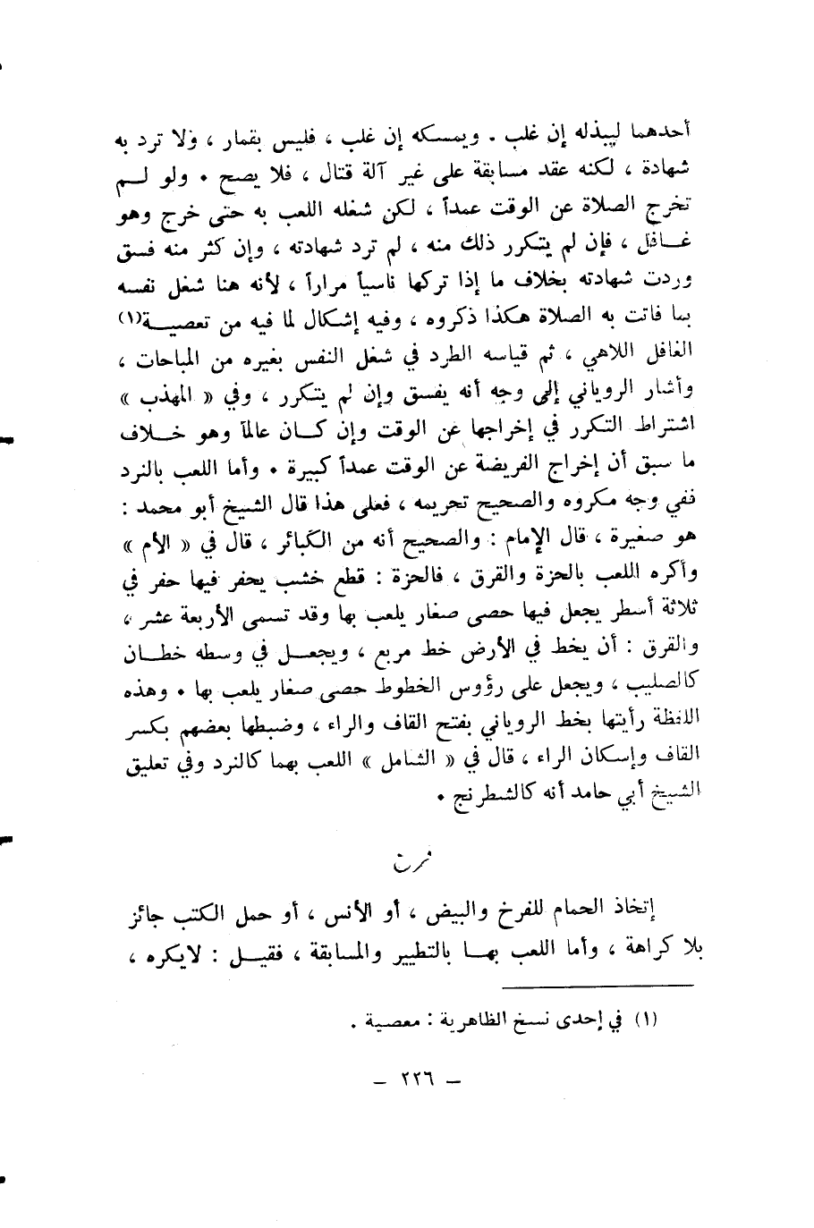 وَأَمَّا اللَّعِبُ بِالنَّرْدِ فَفِي وَجْهٍ مَكْرُوهٌ وَالصَّحِيحُ تَحْرِيمُهُ، فَعَلَى هَذَا قَالَ الشَّيْخُ أَبُو مُحَمَّدٍ: هُوَ صَغِيرَةٌ، قَالَ الْإِمَامُ: وَالصَّحِيحُ أَنَّهُ مِنَ الْكَبَائِرِ، قَالَ فِي «الْأُمِّ» وَأَكْرَهَ اللَّعِبَ بِالْحَزَّةِ وَالْقَرَقَ، فَالْحَزَّةُ: قِطَعُ خَشَبٍ يُحْفَرُ فِيهَا حُفَرٌ فِي ثَلَاثَةِ أَسْطُرٍ يُجْعَلُ فِيهَا حَصًى صِغَارٌ يُلْعَبُ بِهَا وَقَدْ تُسَمَّى الْأَرْبَعَةَ عَشَرَ، وَالْقَرَقُ: أَنْ يُخَطَّ فِي الْأَرْضِ خَطٌّ مُرَبَّعٌ، وَيُجْعَلُ فِي وَسَطِهِ خَطَّانِ كَالصَّلِيبِ، وَيُجْعَلُ عَلَى رُءُوسِ الْخُطُوطِ حَصًى صِغَارٌ يُلْعَبُ بِهَا. وَهَذِهِ اللَّفْظَةُ رَأَيْتُهَا بِخَطِّ الرُّويَانِيِّ بِفَتْحِ الْقَافِ وَالرَّاءِ، وَضَبَطَهَا بَعْضُهُمْ بِكَسْرِ الْقَافِ وَإِسْكَانِ الرَّاءِ، قَالَ فِي «الشَّامِلِ» اللَّعِبُ بِهِمَا كَالنَّرْدِ وَفِي تَعْلِيقِ الشَّيْخِ أَبِي حَامِدٍ أَنَّهُ كَالشِّطْرَنْجِ.