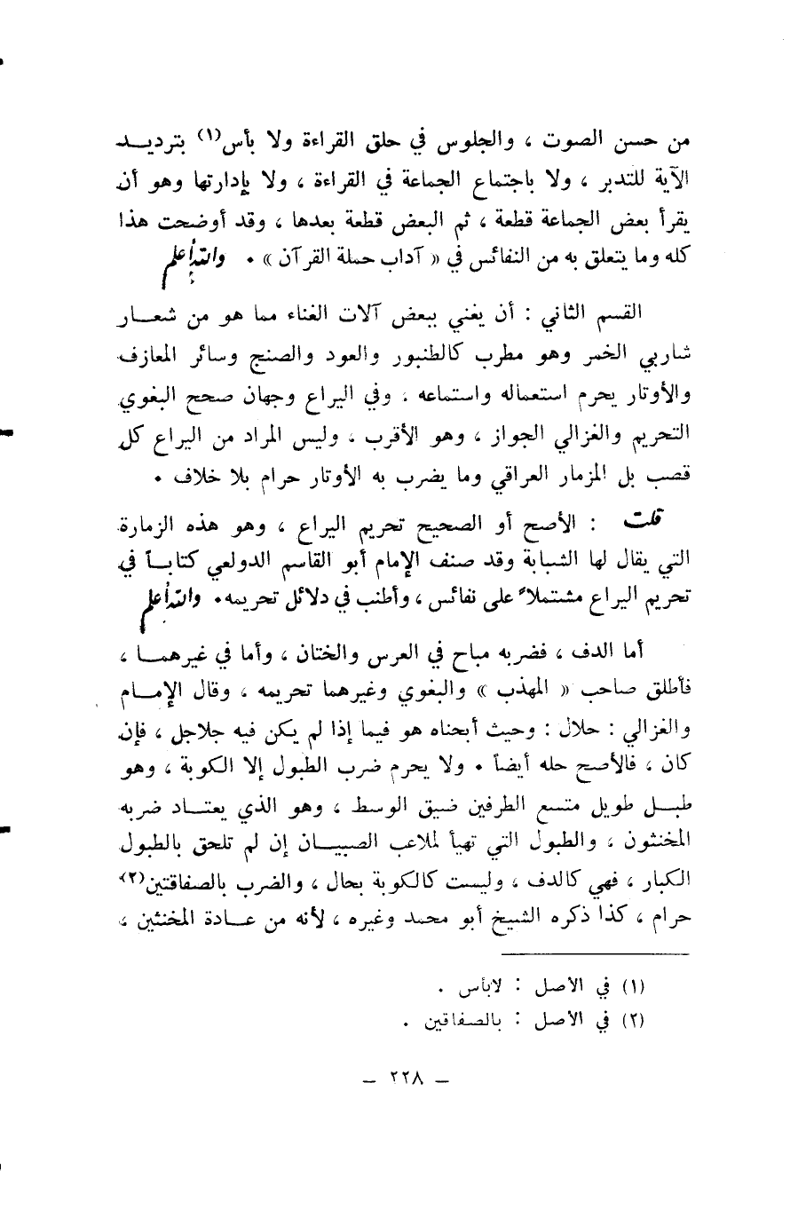 قُلْتُ: الْأَصَحُّ أَوِ الصَّحِيحُ تَحْرِيمُ الْيَرَاعِ، وَهُوَ هَذِهِ الزَّمَّارَةُ الَّتِي يُقَالُ لَهَا الشَّبَّابَةُ وَقَدْ صَنَّفَ الْإِمَامُ أَبُو الْقَاسِمِ الدَّوْلَعِيُّ كِتَابًا فِي تَحْرِيمِ الْيَرَاعِ مُشْتَمِلًا عَلَى نَفَائِسَ، وَأَطْنَبَ فِي دَلَائِلِ تَحْرِيمِهِ. وَاللَّهُ أَعْلَمُ.