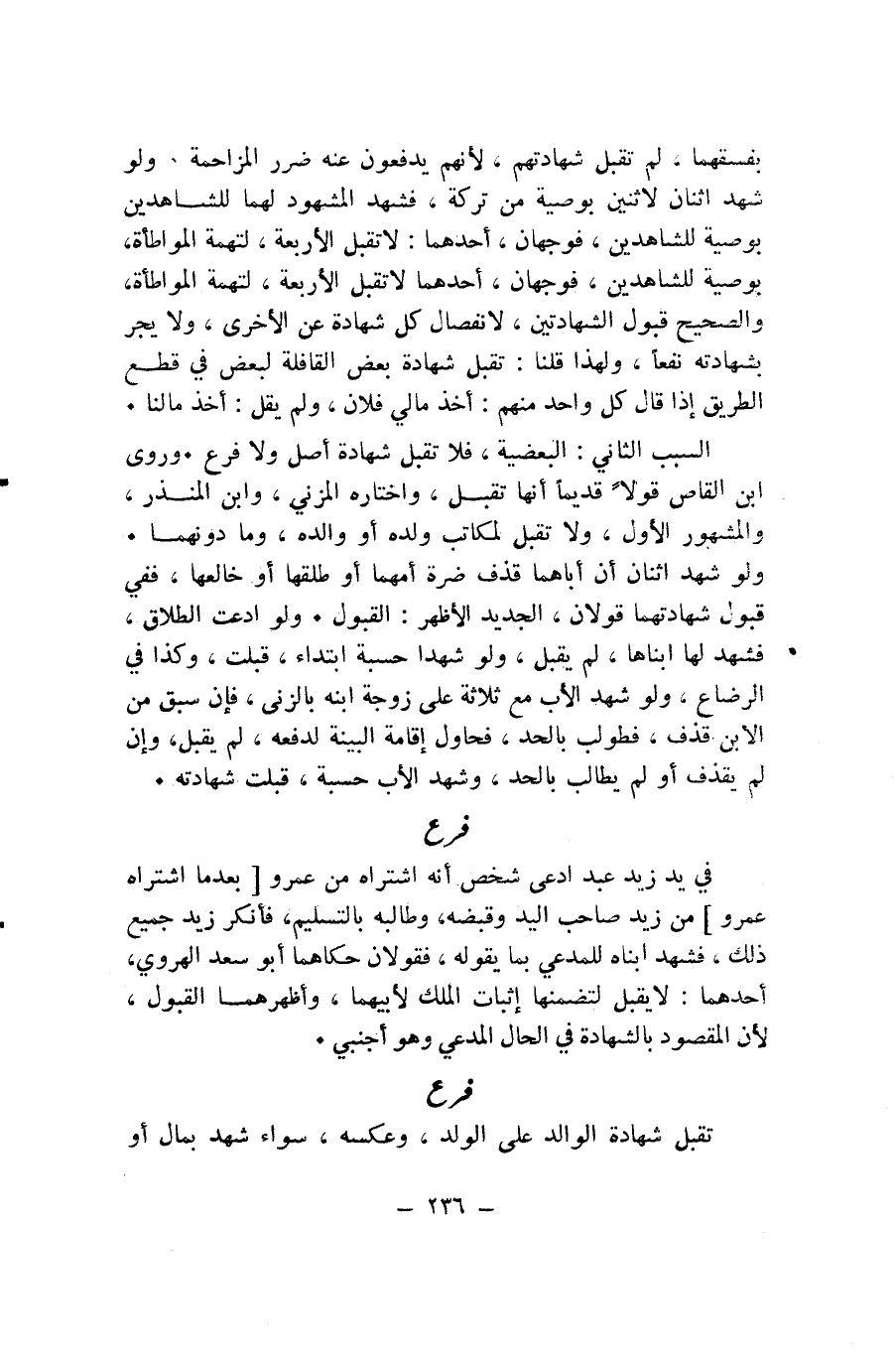 السَّبَبُ الثَّانِي: الْبَعْضِيَّةُ، فَلَا تُقْبَلُ شَهَادَةُ أَصْلٍ وَلَا فَرْعٍ. وَرَوَى ابْنُ الْقَاصِّ قَوْلًا قَدِيمًا أَنَّهَا تُقْبَلُ، وَاخْتَارَهُ الْمُزَنِيُّ، وَابْنُ الْمُنْذِرِ، وَالْمَشْهُورُ الْأَوَّلُ، وَلَا تُقْبَلُ لِمُكَاتَبِ وَلَدِهِ أَوْ وَالِدِهِ، وَمَا دُونَهُمَا. وَلَوْ شَهِدَ اثْنَانِ أَنَّ أَبَاهُمَا قَذَفَ ضُرَّةَ أُمِّهِمَا أَوْ طَلَّقَهَا أَوْ خَالَعَهَا، فَفِي قَبُولِ شَهَادَتِهِمَا قَوْلَانِ، الْجَدِيدُ الْأَظْهَرُ: الْقَبُولُ. وَلَوِ ادَّعَتِ الطَّلَاقَ، فَشَهِدَ لَهَا ابْنَاهَا، لَمْ يُقْبَلْ، وَلَوْ شَهِدَا حِسْبَةً ابْتِدَاءً، قُبِلَتْ، وَكَذَا فِي الرَّضَاعِ، وَلَوْ شَهِدَ الْأَبُ مَعَ ثَلَاثَةٍ عَلَى زَوْجَةِ ابْنِهِ بِالزِّنَى، فَإِنْ سَبَقَ مِنْ الِابْنِ قَذْفٌ، فَطُولِبَ بِالْحَدِّ، فَحَاوَلَ إِقَامَةَ الْبَيِّنَةِ لِدَفْعِهِ، لَمْ يُقْبَلْ، وَإِنْ لَمْ يَقْذِفْ أَوْ لَمْ يُطَالِبْ بِالْحَدِّ، وَشَهِدَ الْأَبُ حِسْبَةً، قُبِلَتْ شَهَادَتُهُ.