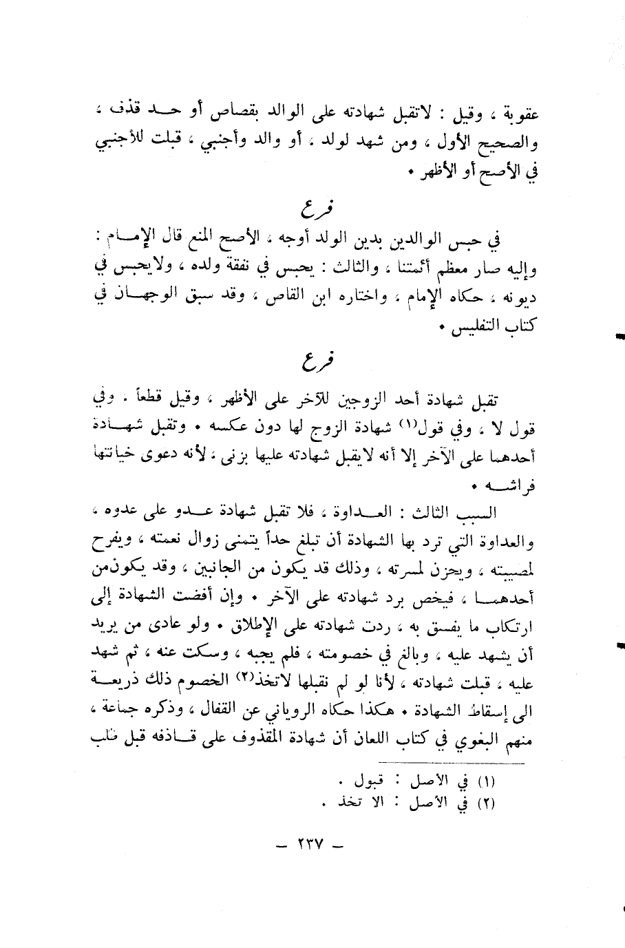 عُقُوبَةٍ، وَقِيلَ: لَا تُقْبَلُ شَهَادَتُهُ عَلَى الْوَالِدِ بِقِصَاصٍ أَوْ حَدِّ قَذْفٍ، وَالصَّحِيحُ الْأَوَّلُ، وَمَنْ شَهِدَ لِوَلَدٍ، أَوْ وَالِدٍ وَأَجْنَبِيٍّ، قُبِلَتْ لِلْأَجْنَبِيِّ فِي الْأَصَحِّ أَوِ الْأَظْهَرِ.