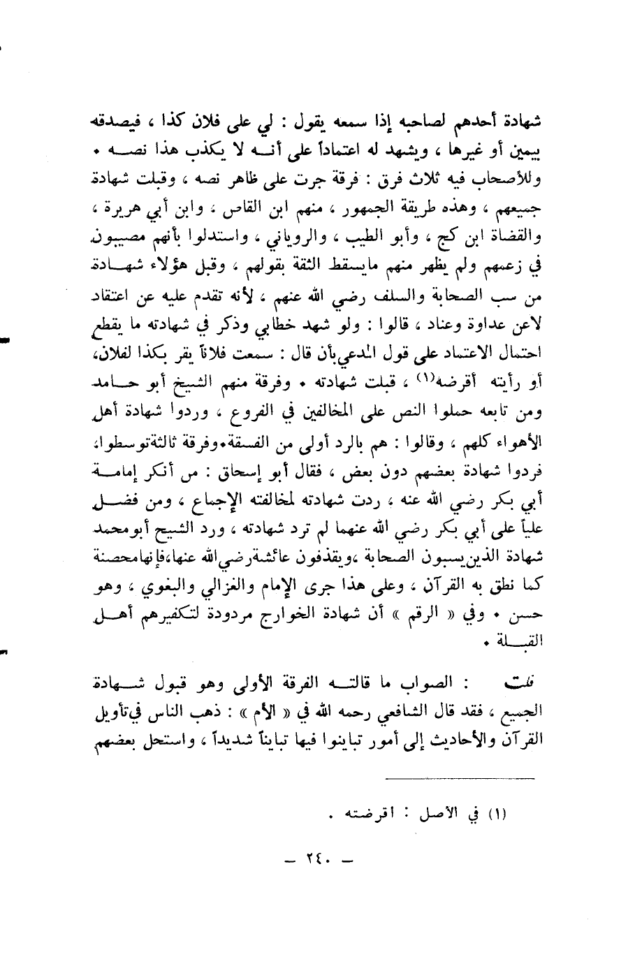 قُلْتُ: الصَّوَابُ مَا قَالَتْهُ الْفِرْقَةُ الْأُولَى وَهُوَ قَبُولُ شَهَادَةِ الْجَمِيعِ، فَقَدْ قَالَ الشَّافِعِيُّ - رَحِمَهُ اللَّهُ - فِي «الْأُمِّ» : ذَهَبَ النَّاسُ فِي تَأْوِيلِ الْقُرْآنِ وَالْأَحَادِيثِ إِلَى أُمُورٍ تَبَايَنُوا فِيهَا تَبَايُنًا شَدِيدًا، وَاسْتَحَلَّ بَعْضُهُمْ