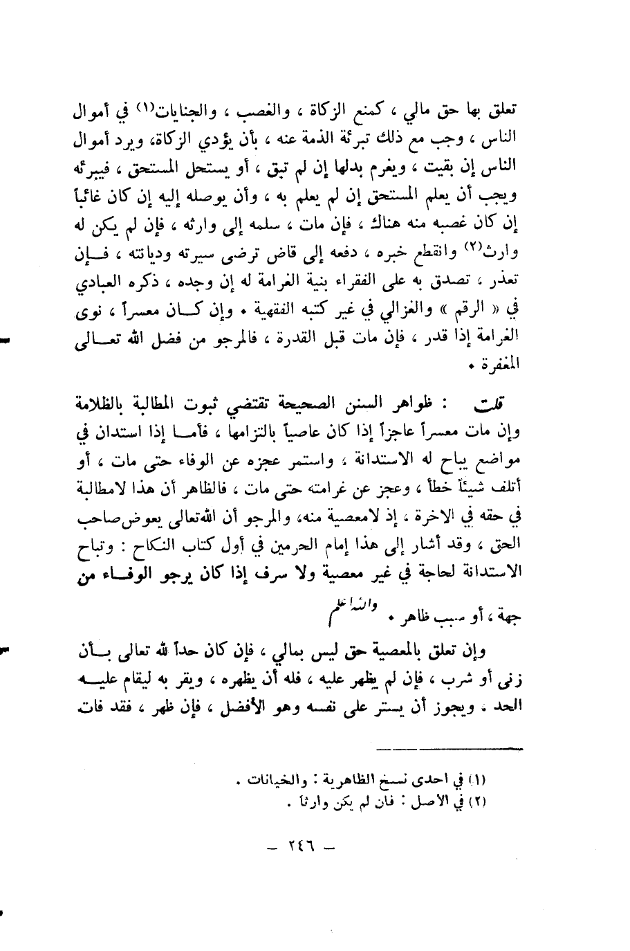 قُلْتُ: ظَوَاهِرُ السُّنَنِ الصَّحِيحَةِ تَقْتَضِي ثُبُوتَ الْمُطَالَبَةِ بِالظُّلَامَةِ وَإِنْ مَاتَ مُعْسِرًا عَاجِزًا إِذَا كَانَ عَاصِيًا بِالْتِزَامِهَا، فَأَمَّا إِذَا اسْتَدَانَ فِي مَوَاضِعَ يُبَاحُ لَهُ الِاسْتِدَانَةُ، وَاسْتَمَرَّ عَجْزُهُ عَنِ الْوَفَاءِ حَتَّى مَاتَ، أَوْ أَتْلَفَ شَيْئًا خَطَأً، وَعَجَزَ عَنْ غَرَامَتِهِ حَتَّى مَاتَ، فَالظَّاهِرُ أَنَّ هَذَا لَا مُطَالَبَةَ فِي حَقِّهِ فِي الْآخِرَةِ، إِذْ لَا مَعْصِيَةَ مِنْهُ، وَالْمَرْجُوُّ أَنَّ اللَّهَ - تَعَالَى - يُعَوِّضُ صَاحِبَ الْحَقِّ، وَقَدْ أَشَارَ إِلَى هَذَا إِمَامُ الْحَرَمَيْنِ فِي أَوَّلِ كِتَابِ النِّكَاحِ: وَتُبَاحُ الِاسْتِدَانَةُ لِحَاجَةٍ فِي غَيْرِ مَعْصِيَةٍ وَلَا سَرَفٍ إِذَا كَانَ يَرْجُو الْوَفَاءَ مِنْ جِهَةٍ، أَوْ سَبَبٍ ظَاهِرٍ. وَاللَّهُ أَعْلَمُ.