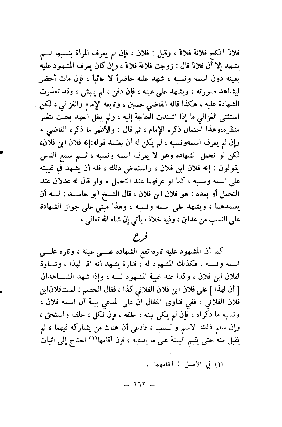 كَمَا أَنَّ الْمَشْهُودَ عَلَيْهِ تَارَةً تَقَعُ الشَّهَادَةُ عَلَى عَيْنِهِ، وَتَارَةً عَلَى اسْمِهِ وَنَسَبِهِ، فَكَذَلِكَ الْمَشْهُودُ لَهُ، فَتَارَةً يَشْهَدُ أَنَّهُ أَقَرَّ لِهَذَا، وَتَارَةً لِفُلَانٍ ابْنِ فُلَانٍ، وَكَذَا عِنْدَ غَيْبَةِ الْمَشْهُودِ لَهُ، وَإِذَا شَهِدَ الشَّاهِدَانِ (أَنَّ لِهَذَا) عَلَى فُلَانٍ ابْنِ فُلَانٍ الْفُلَانِيِّ كَذَا، فَقَالَ الْخَصْمُ: لَسْتُ فُلَانَ ابْنَ فُلَانٍ الْفُلَانِيَّ فَفِي فَتَاوَى الْقَفَّالِ أَنَّ عَلَى الْمُدَّعِي بَيِّنَةَ أَنَّ اسْمَهُ فُلَانٌ، وَنَسَبَهُ مَا ذَكَرَاهُ، فَإِنْ لَمْ يَكُنْ بَيِّنَةٌ حَلَّفَهُ، فَإِنْ نَكَلَ، حَلَفَ وَاسْتَحَقَّ، وَإِنْ سَلِمَ ذَلِكَ الِاسْمُ وَالنَّسَبُ، فَادَّعَى أَنَّ هُنَاكَ مَنْ يُشَارِكُهُ فِيهِمَا، لَمْ يُقْبَلْ مِنْهُ حَتَّى يُقِيمَ الْبَيِّنَةَ عَلَى مَا يَدَّعِيهِ، فَإِنْ أَقَامَهَا احْتَاجَ إِلَى إِثْبَاتِ