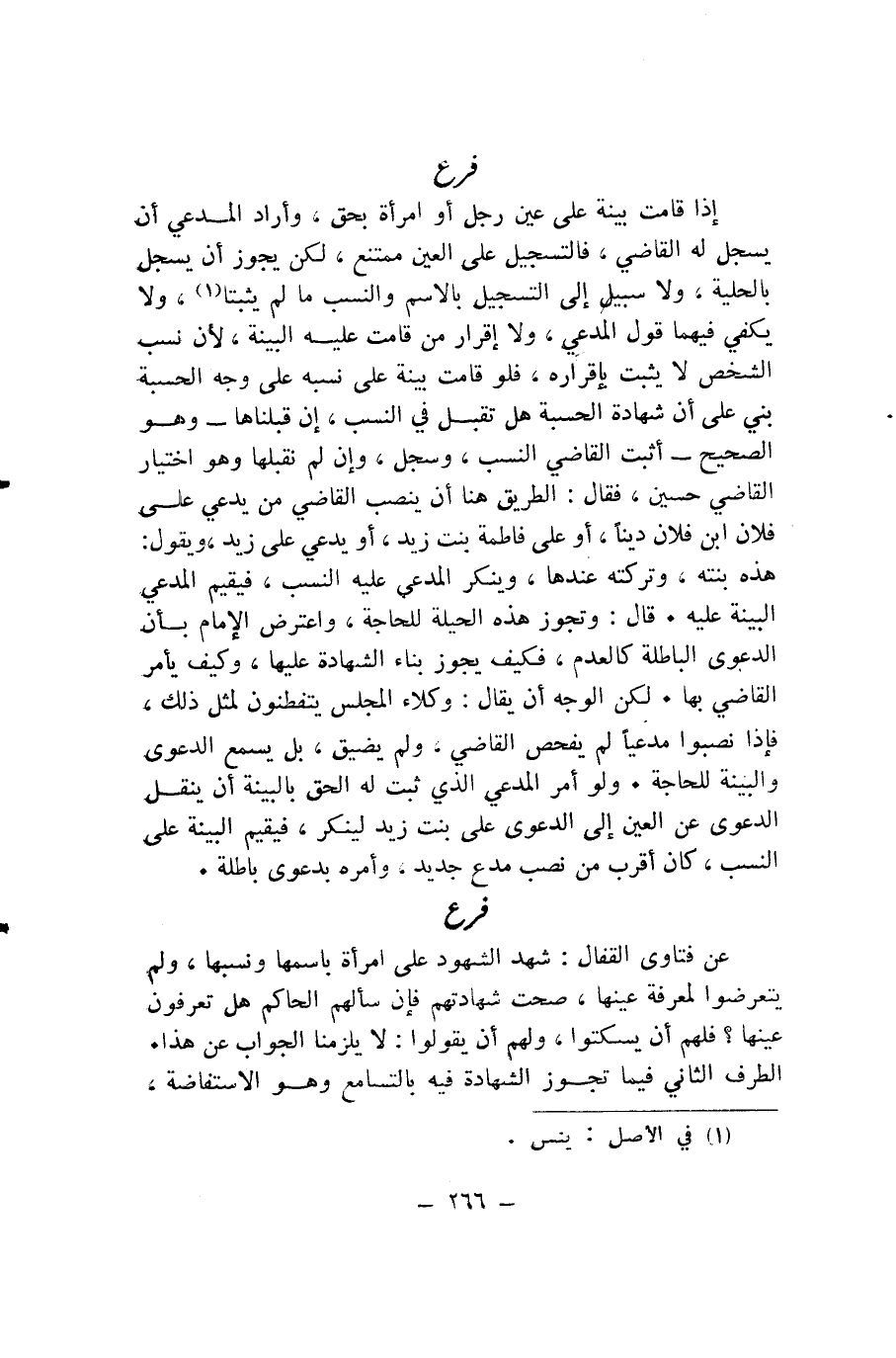 عَنْ فَتَاوَى الْقَفَّالِ: شَهِدَ الشُّهُودُ عَلَى امْرَأَةٍ بِاسْمِهَا وَنَسَبِهَا، وَلَمْ يَتَعَرَّضُوا لِمَعْرِفَةِ عَيْنِهَا، صَحَّتْ شَهَادَتُهُمْ فَإِنْ سَأَلَهُمُ الْحَاكِمُ هَلْ تَعْرِفُونَ عَيْنَهَا؟ فَلَهُمْ أَنْ يَسْكُتُوا، وَلَهُمْ أَنْ يَقُولُوا: لَا يَلْزَمُنَا الْجَوَابُ عَنْ هَذَا.