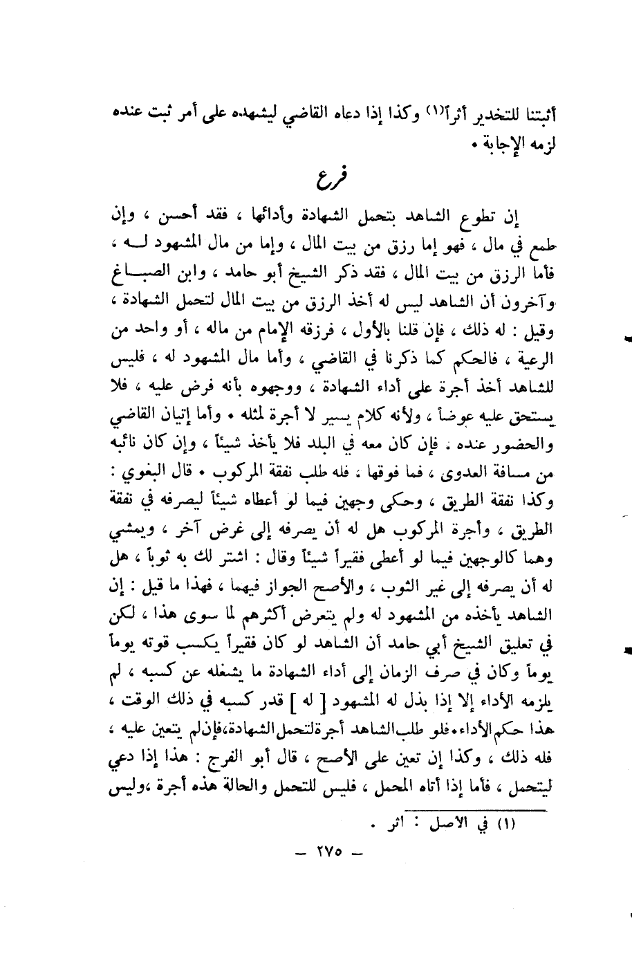 وَأَمَّا إِتْيَانُ الْقَاضِي وَالْحُضُورُ عِنْدَهُ، فَإِنْ كَانَ مَعَهُ فِي الْبَلَدِ فَلَا يَأْخُذْ شَيْئًا، وَإِنْ كَانَ نَائِبُهُ مِنْ مَسَافَةِ الْعَدْوَى، فَمَا فَوْقَهَا، فَلَهُ طَلَبُ نَفَقَةِ الْمَرْكُوبِ. قَالَ الْبَغَوِيُّ: وَكَذَا نَفَقَةُ الطَّرِيقِ، وَحَكَى وَجْهَيْنِ فِيمَا لَوْ أَعْطَاهُ شَيْئًا لِيَصْرِفَهُ فِي نَفَقَةِ الطَّرِيقِ، وَأُجْرَةُ الْمَرْكُوبِ هَلْ لَهُ أَنْ يَصْرِفَهُ إِلَى غَرَضٍ آخَرَ، وَيَمْشِيَ، وَهُمَا كَالْوَجْهَيْنِ فِيمَا لَوْ أَعْطَى فَقِيرًا شَيْئًا وَقَالَ: اشْتَرِ لَكَ بِهِ ثَوْبًا، هَلْ لَهُ أَنْ يَصْرِفَهُ إِلَى غَيْرِ الثَّوْبِ، وَالْأَصَحُّ الْجَوَازُ فِيهِمَا، فَهَذَا مَا قِيلَ: إِنَّ الشَّاهِدَ يَأْخُذُهُ مِنَ الْمَشْهُودِ لَهُ وَلَمْ يَتَعَرَّضْ أَكْثَرُهُمْ لِمَا سِوَى هَذَا، لَكِنْ فِي تَعْلِيقِ الشَّيْخِ أَبِي حَامِدٍ أَنَّ الشَّاهِدَ لَوْ كَانَ فَقِيرًا يَكْسِبُ قُوتَهُ يَوْمًا يَوْمًا وَكَانَ فِي صَرْفِ الزَّمَانِ إِلَى أَدَاءِ الشَّهَادَةِ مَا يَشْغَلُهُ عَنْ كَسْبِهِ، لَمْ يَلْزَمْهُ الْأَدَاءُ إِلَّا إِذَا بَذَلَ لَهُ الْمَشْهُودُ (لَهُ) قَدْرَ كَسْبِهِ فِي ذَلِكَ الْوَقْتِ، هَذَا حُكْمُ الْأَدَاءِ. فَلَوْ طَلَبَ الشَّاهِدُ أُجْرَةً لِتَحَمُّلِ الشَّهَادَةِ، فَإِنْ لَمْ يَتَعَيَّنْ عَلَيْهِ، فَلَهُ ذَلِكَ، وَكَذَا إِنْ تَعَيَّنَ عَلَى الْأَصَحِّ، قَالَ أَبُو الْفَرَجِ: هَذَا إِذَا دُعِيَ لِيَتَحَمَّلَ، فَأَمَّا إِذَا أَتَاهُ الْمُحَمَّلُ، فَلَيْسَ لِلتَّحَمُّلِ - وَالْحَالَةُ هَذِهِ - أُجْرَةٌ، وَلَيْسَ