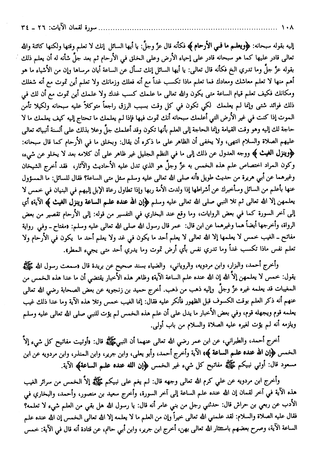 وأخرج أحمد، والبزار، وابن مردويه، والروياني، والضياء بسند صحيح عن بريدة قال «سمعت رسول الله صلّى الله عليه وسلم يقول: خمس لا يعلمهن إلّا الله إن الله عنده علم الساعة الآية»
