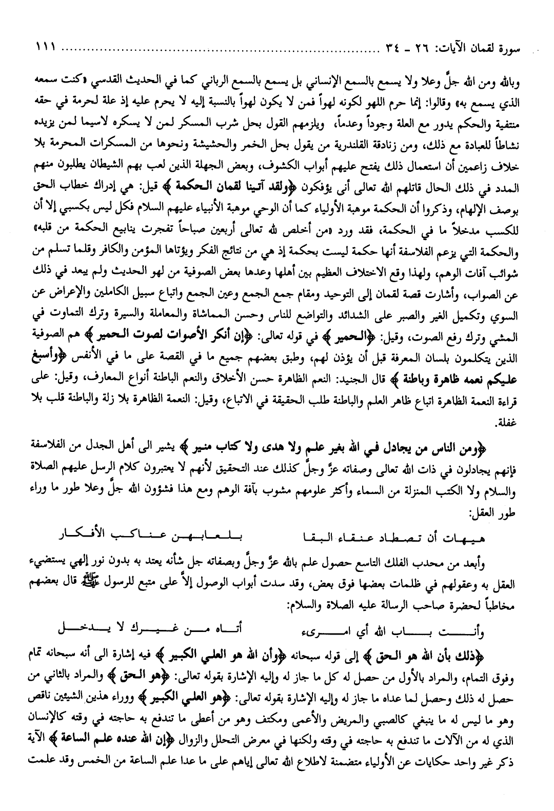والحكمة التي يزعم الفلاسفة أنها حكمة ليست بحكمة إذ هي من نتائج الفكر ويؤتاها المؤمن والكافر وقلما تسلم من شوائب آفات الوهم، ولهذا وقع الاختلاف العظيم بين أهلها وعدها بعض الصوفية من لهو الحديث ولم يبعد في ذلك عن الصواب، وأشارت قصة لقمان إلى التوحيد ومقام جمع الجمع وعين الجمع واتباع سبيل الكاملين والإعراض عن السوي وتكميل الغير والصبر على الشدائد والتواضع للناس وحسن المماشاة والمعاملة والسيرة وترك التماوت في المشي وترك رفع الصوت، وقيل: الْحَمِيرِ في قوله تعالى: إِنَّ أَنْكَرَ الْأَصْواتِ لَصَوْتُ الْحَمِيرِ هم الصوفية الذين يتكلمون بلسان المعرفة قبل أن يؤذن لهم، وطبق بعضهم جميع ما في القصة على ما في الأنفس وَأَسْبَغَ عَلَيْكُمْ نِعَمَهُ ظاهِرَةً وَباطِنَةً قال الجنيد: النعم الظاهرة حسن الأخلاق والنعم الباطنة أنواع المعارف، وقيل: على قراءة النعمة الظاهرة اتباع ظاهر العلم والباطنة طلب الحقيقة في الاتباع، وقيل: النعمة الظاهرة بلا زلة والباطنة قلب بلا غفلة.