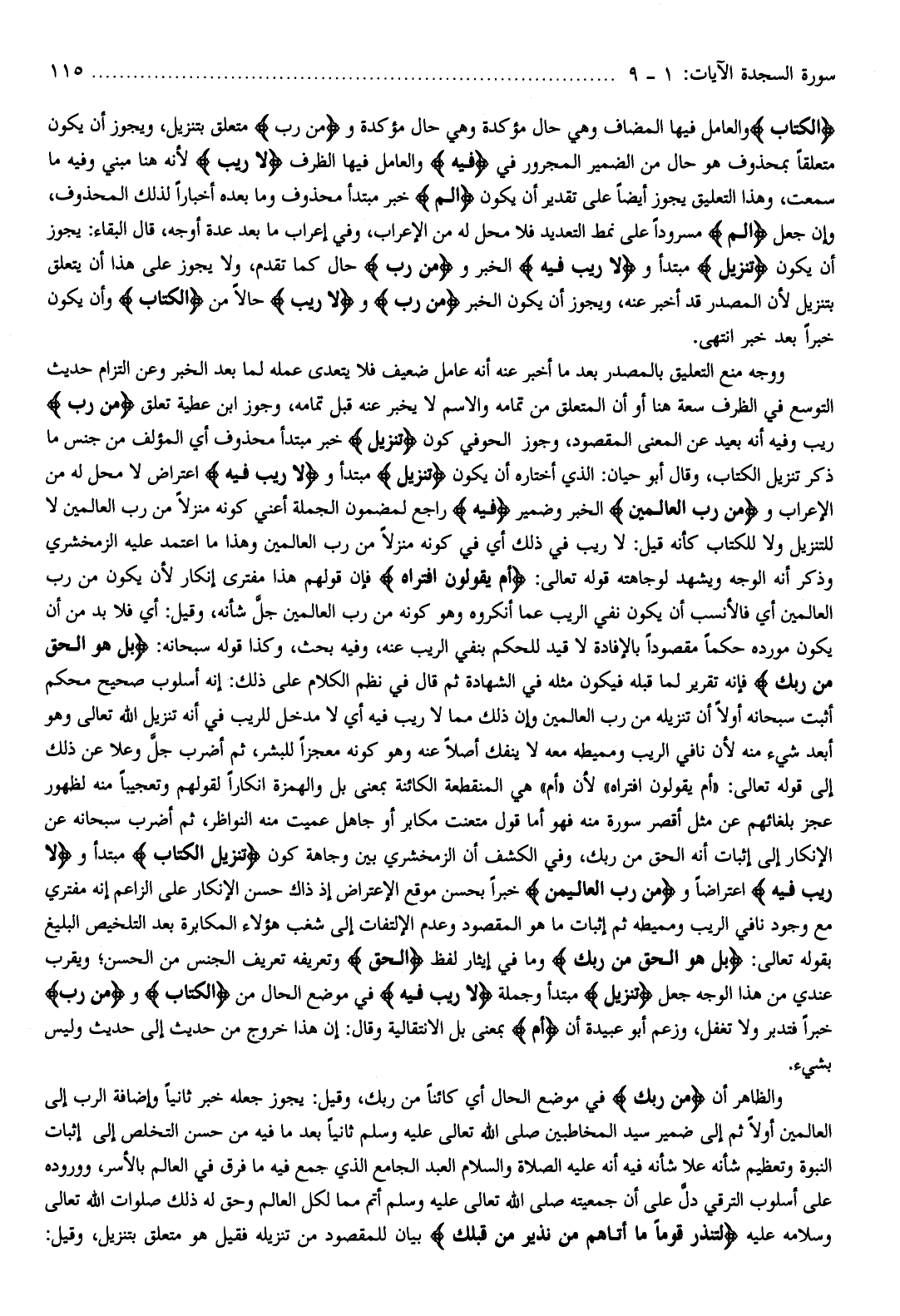 ووجه منع التعليق بالمصدر بعد ما أخبر عنه أنه عامل ضعيف فلا يتعدى عمله لما بعد الخبر وعن التزام حديث التوسع في الظرف سعة هنا أو أن المتعلق من تمامه والاسم لا يخبر عنه قبل تمامه، وجوز ابن عطية تعلق مِنْ رَبِّ ريب وفيه أنه بعيد عن المعنى المقصود، وجوز الحوفي كون تَنْزِيلُ خبر مبتدأ محذوف أي المؤلف من جنس ما ذكر تنزيل الكتاب، وقال أبو حيان: الذي أختاره أن يكون تَنْزِيلُ مبتدأ ولا رَيْبَ فِيهِ اعتراض لا محل له من الإعراب ومِنْ رَبِّ الْعالَمِينَ الخبر وضمير فِيهِ راجع لمضمون الجملة أعني كونه منزلا من رب العالمين لا للتنزيل ولا للكتاب كأنه قيل: لا ريب في ذلك أي في كونه منزلا من رب العالمين وهذا ما اعتمد عليه الزمخشري وذكر أنه الوجه ويشهد لوجاهته قوله تعالى: أَمْ يَقُولُونَ افْتَراهُ فإن قولهم هذا مفترى إنكار لأن يكون من رب العالمين أي فالأنسب أن يكون نفي الريب عما أنكروه وهو كونه من رب العالمين جلّ شأنه، وقيل: أي فلا بد من أن يكون مورده حكما مقصودا بالإفادة لا قيد للحكم بنفي الريب عنه، وفيه بحث، وكذا قوله سبحانه: بَلْ هُوَ الْحَقُّ مِنْ رَبِّكَ فإن تقرير لما قبله فيكون مثله في الشهادة ثم قال في نظم الكلام على ذلك: إنه أسلوب صحيح محكم أثبت سبحانه أولا أن تنزيله من رب العالمين وإن ذلك مما لا ريب فيه أي لا مدخل للريب في أنه تنزيل الله تعالى وهو أبعد شيء منه لأن نافي الريب ومميطه معه لا ينفك أصلا عنه وهو كونه معجزا للبشر، ثم أضرب جلّ وعلا عن ذلك إلى قوله تعالى: «أم يقولون افتراه» لأن «أم» هي المنقطعة الكائنة بمعنى بل والهمزة إنكارا لقولهم وتعجيبا منه لظهور عجز بلغائهم عن مثل أقصر سورة منه فهو أما قول متعنت مكابر أو جاهل عميت منه النواظر، ثم أضرب سبحانه عن الإنكار إلى إثبات أنه الحق من ربك، وفي الكشف أن الزمخشري بين وجاهة كون تَنْزِيلُ الْكِتابِ مبتدأ ولا رَيْبَ فِيهِ اعتراضا ومِنْ رَبِّ الْعالَمِينَ خبرا بحسن موقع الاعتراض إذ ذاك حسن الإنكار على الزاعم إنه مفتري مع وجود نافي الريب ومميطه ثم إثبات ما هو المقصود وعدم الالتفات إلى شغب هؤلاء المكابرة بعد التلخيص البليغ بقوله تعالى: بَلْ هُوَ الْحَقُّ مِنْ رَبِّكَ وما في إيثار لفظ الْحَقُّ وتعريفه تعريف الجنس من الحسن ويقرب عندي من هذا الوجه جعل تَنْزِيلُ مبتدأ وجملة لا رَيْبَ فِيهِ في موضع الحال من الْكِتابِ ومِنْ رَبِّ خبرا فتدبر ولا تغفل، وزعم أبو عبيدة أن أَمْ بمعنى بل الانتقالية وقال: إن هذا خروج من حديث إلى حديث وليس بشيء.