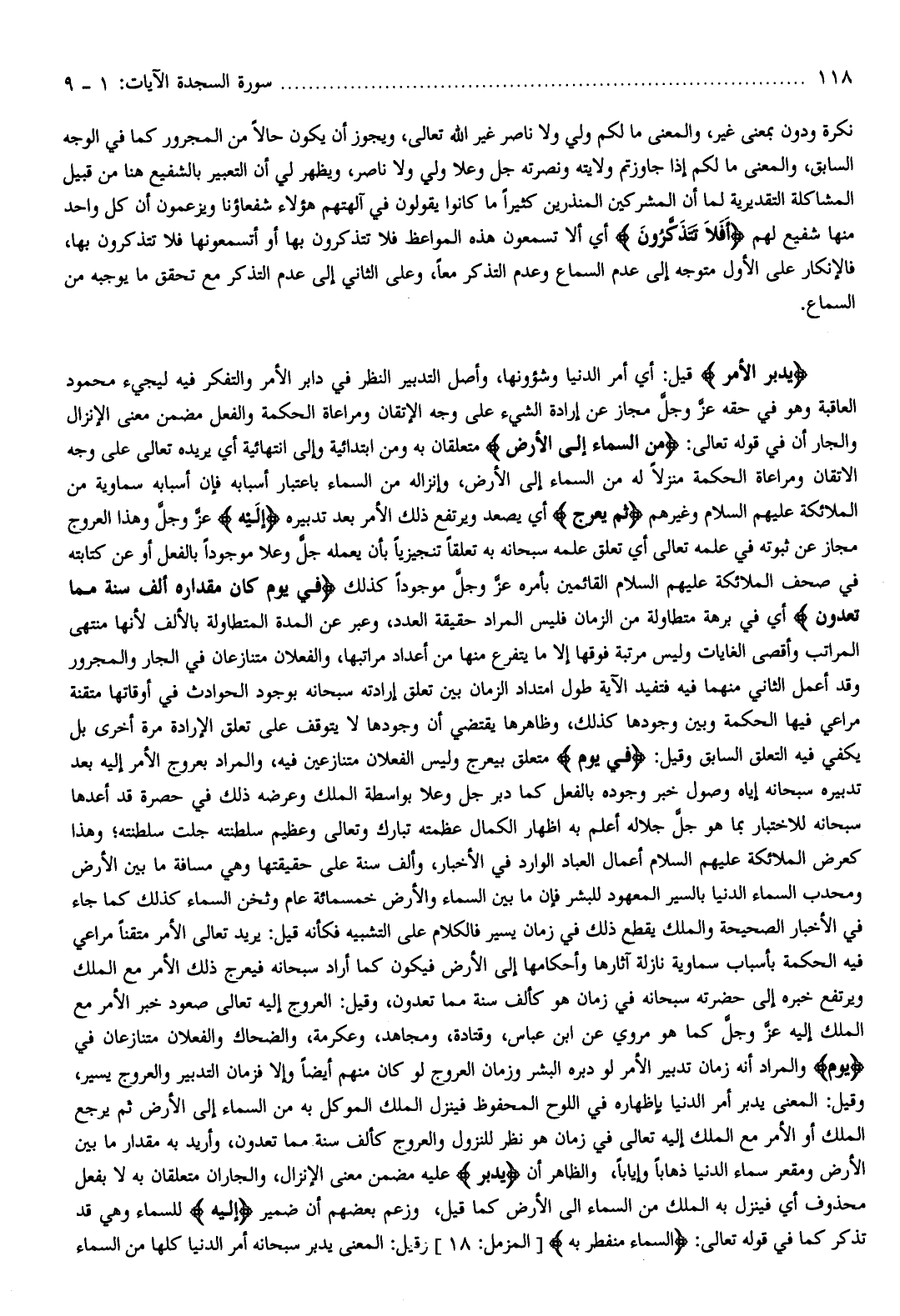 يُدَبِّرُ الْأَمْرَ قيل: أي أمر الدنيا وشؤونها، وأصل التدبير النظر في دابر الأمر والتفكر فيه ليجيء محمود العاقبة وهو في حقه عزّ وجلّ مجاز عن إرادة الشيء على وجه الإتقان ومراعاة الحكمة والفعل مضمن معنى الإنزال والجار أن في قوله تعالى: مِنَ السَّماءِ إِلَى الْأَرْضِ متعلقان به ومن ابتدائية وإلى انتهائية أي يريده تعالى على وجه الإتقان ومراعاة الحكمة منزلا له من السماء إلى الأرض، وإنزاله من السماء باعتبار أسبابه فإن أسبابه سماوية من الملائكة عليهم السلام وغيرهم ثُمَّ يَعْرُجُ أي يصعد ويرتفع ذلك الأمر بعد تدبيره إِلَيْهِ عزّ وجلّ وهذا العروج مجاز عن ثبوته في علمه تعالى أي تعلق علمه سبحانه به تعلقا تنجيزيا بأن يعمله جلّ وعلا موجودا بالفعل أو عن كتابته في صحف الملائكة عليهم السلام القائمين بأمره عزّ وجلّ موجودا كذلك فِي يَوْمٍ كانَ مِقْدارُهُ أَلْفَ سَنَةٍ مِمَّا تَعُدُّونَ أي في برهة متطاولة من الزمان فليس المراد حقيقة العدد، وعبر عن المدة المتطاولة بالألف لأنها منتهى المراتب وأقصى الغايات وليس مرتبة فوقها إلا ما يتفرع منها من أعداد مراتبها، والفعلان متنازعان في الجار والمجرور وقد أعمل الثاني منهما فيه فتفيد الآية طول امتداد الزمان بين تعلق إرادته سبحانه بوجود الحوادث في أوقاتها متقنة مراعي فيها الحكمة وبين وجودها كذلك، وظاهرها يقتضي أن وجودها لا يتوقف على تعلق الإرادة مرة أخرى بل يكفي فيه التعلق السابق وقيل: فِي يَوْمٍ متعلق بيعرج وليس الفعلان متنازعين فيه، والمراد بعروج الأمر إليه بعد تدبيره سبحانه إياه وصول خبر وجوده بالفعل كما دبر جل وعلا بواسطة الملك وعرضه ذلك في حصرة قد أعدها سبحانه للاختبار بما هو جلّ جلاله أعلم به اظهار الكمال عظمته تبارك وتعالى وعظيم سلطنته جلت سلطنته وهذا كعرض الملائكة عليهم السلام أعمال العباد الوارد في الأخبار، وألف سنة على حقيقتها وهي مسافة ما بين الأرض ومحدب السماء الدنيا بالسير المعهود للبشر فإن ما بين السماء والأرض خمسمائة عام وثخن السماء كذلك كما جاء في الأخبار الصحيحة والملك يقطع ذلك في زمان يسير فالكلام على التشبيه فكأنه قيل: يريد تعالى الأمر متقنا مراعي فيه الحكمة بأسباب سماوية نازلة آثارها وأحكامها إلى الأرض فيكون كما أراد سبحانه فيعرج ذلك الأمر مع الملك ويرتفع خبره إلى حضرته سبحانه في زمان هو كألف سنة مما تعدون، وقيل: العروج إليه تعالى صعود خبر الأمر مع الملك إليه عزّ وجلّ كما هو مروي عن ابن عباس، وقتادة، ومجاهد، وعكرمة، والضحاك والفعلان متنازعان في يَوْمٍ والمراد أنه زمان تدبير الأمر لو دبره البشر وزمان العروج لو كان منهم أيضا وإلا فزمان التدبير والعروج يسير، وقيل: المعنى يدبر أمر الدنيا بإظهاره في اللوح المحفوظ فينزل الملك الموكل به من السماء إلى الأرض ثم يرجع الملك أو الأمر مع الملك إليه تعالى في زمان هو نظر للنزول والعروج كألف سنة مما تعدون، وأريد به مقدار ما بين الأرض ومقعر سماء الدنيا ذهابا وإيابا، والظاهر أن يُدَبِّرُ عليه مضمن معنى الإنزال، والجاران متعلقان به لا بفعل محذوف أي فينزل به الملك من السماء إلى الأرض كما قيل، وزعم بعضهم أن ضمير إِلَيْهِ للسماء وهي قد تذكر كما في قوله تعالى: السَّماءُ مُنْفَطِرٌ بِهِ [المزمل: 18] وقيل: المعنى يدبر سبحانه أمر الدنيا كلها من السماء