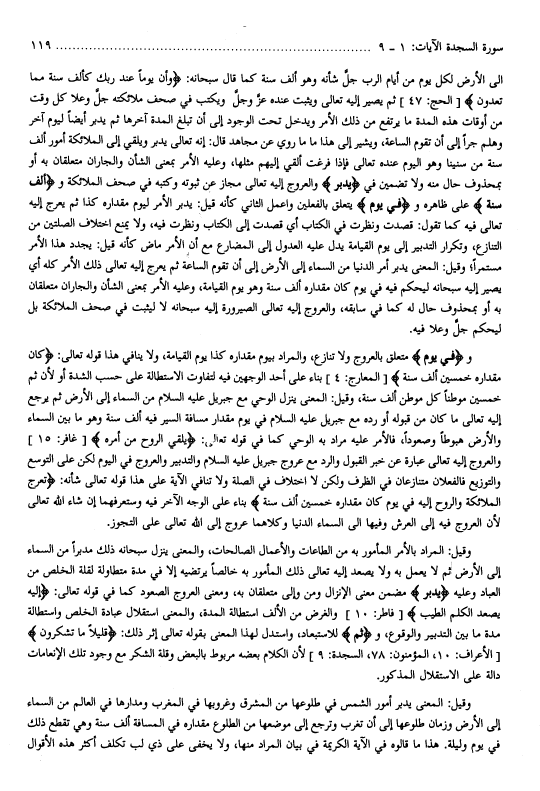 وقيل: المعنى يدبر أمور الشمس في طلوعها من المشرق وغروبها في المغرب ومدارها في العالم من السماء إلى الأرض وزمان طلوعها إلى أن تغرب وترجع إلى موضعها من الطلوع مقداره في المسافة ألف سنة وهي تقطع ذلك في يوم وليلة. هذا ما قالوه في الآية الكريمة في بيان المراد منها، ولا يخفى على ذي لب تكلف أكثر هذه الأقوال