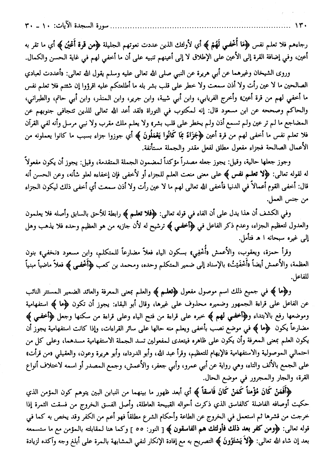 رجاءهم فلا تعلم نفس ما أُخْفِيَ لَهُمْ أي لأولئك الذين عددت نعوتهم الجليلة مِنْ قُرَّةِ أَعْيُنٍ أي ما تقر به أعين، وفي إضافة القرة إلى الأعين على الإطلاق لا إلى أعينهم تنبيه على أن ما أخفي لهم في غاية الحسن والكمال.