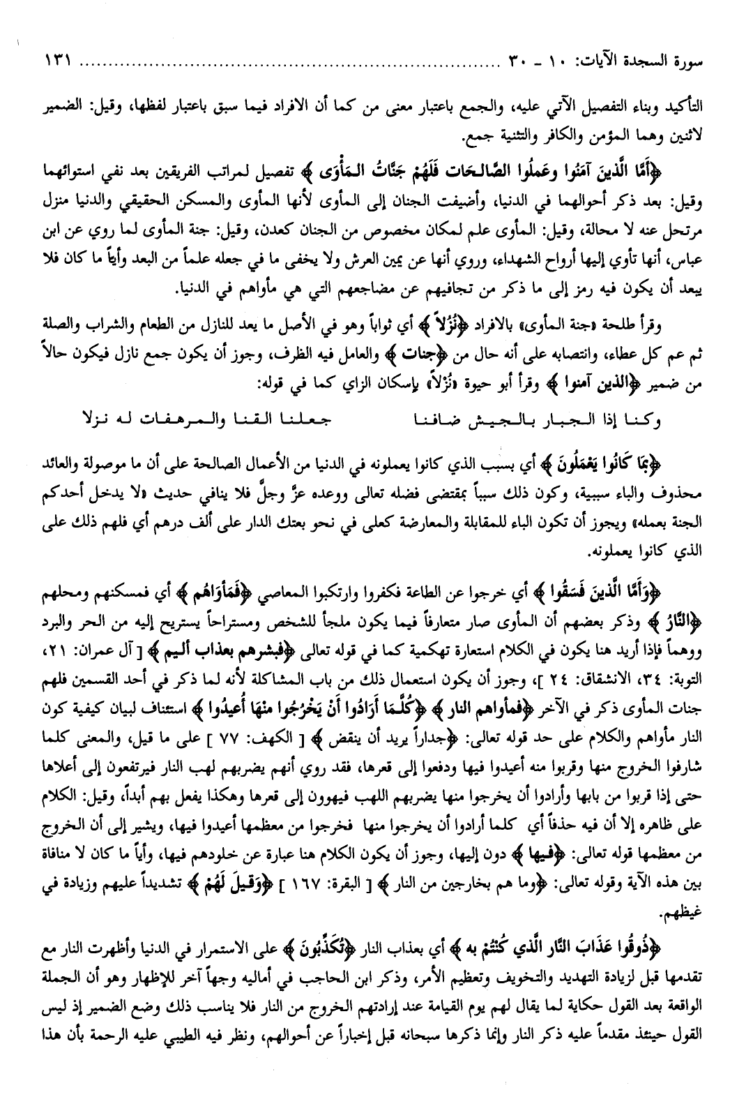 أَمَّا الَّذِينَ آمَنُوا وَعَمِلُوا الصَّالِحاتِ فَلَهُمْ جَنَّاتُ الْمَأْوى تفصيل لمراتب الفريقين بعد نفي استوائهما وقيل: بعد ذكر أحوالهما في الدنيا، وأضيفت الجنان إلى المأوى لأنها المأوى والمسكن الحقيقي والدنيا منزل مرتحل عنه لا محالة، وقيل: المأوى علم لمكان مخصوص من الجنان كعدن، وقيل: جنة المأوى لما روي عن ابن عباس، أنها تأوي إليها أرواح الشهداء، وروي أنها عن يمين العرش ولا يخفى ما في جعله علما من البعد وأيا ما كان فلا يبعد أن يكون فيه رمز إلى ما ذكر من تجافيهم عن مضاجعهم التي هي مأواهم في الدنيا.