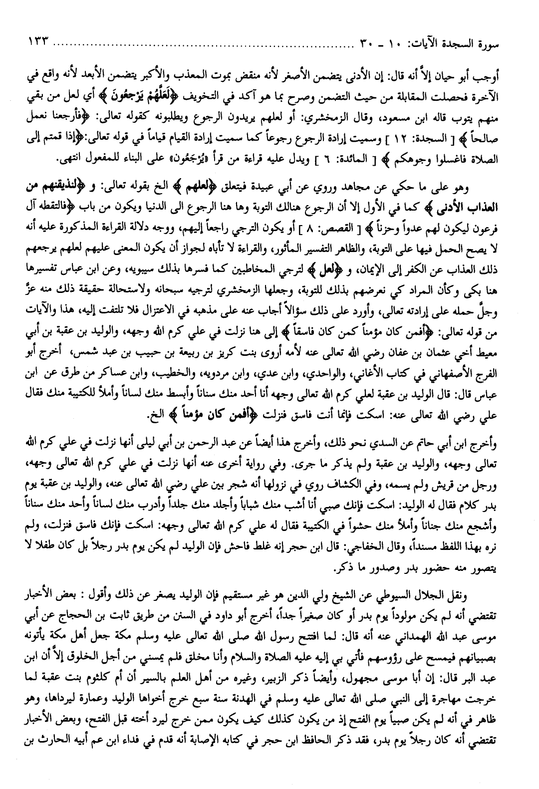 وهو على ما حكي عن مجاهد وروي عن أبي عبيدة فيتعلق لَعَلَّهُمْ إلخ بقوله تعالى: ولَنُذِيقَنَّهُمْ مِنَ الْعَذابِ الْأَدْنى كما في الأول إلا أن الرجوع هنالك التوبة وهاهنا الرجوع الى الدنيا ويكون من باب فَالْتَقَطَهُ آلُ فِرْعَوْنَ لِيَكُونَ لَهُمْ عَدُوًّا وَحَزَناً [القصص: 8] أو يكون الترجي راجعا إليهم، ووجه دلالة القراءة المذكورة عليه أنه لا يصح الحمل فيها على التوبة، والظاهر التفسير المأثور، والقراءة لا تأباه لجواز أن يكون المعنى عليهم لعلهم يرجعهم ذلك العذاب عن الكفر إلى الإيمان، و (لعل) لترجي المخاطبين كما فسرها بذلك سيبويه، وعن ابن عباس تفسيرها هنا بكى وكأن المراد كي نعرضهم بذلك للتوبة، وجعلها الزمخشري لترجيه سبحانه ولاستحالة حقيقة ذلك منه عزّ وجلّ حمله على إرادته تعالى، وأورد على ذلك سؤالا أجاب عنه على مذهبه في الاعتزال فلا تلتفت إليه، هذا والآيات من قوله تعالى: أَفَمَنْ كانَ مُؤْمِناً كَمَنْ كانَ فاسِقاً إلى هنا نزلت في علي كرم الله وجهه، والوليد بن عقبة بن أبي معيط أخي عثمان بن عفان رضي الله تعالى عنه لأمه أروى بنت كريز بن ربيعة بن حبيب بن عبد شمس،