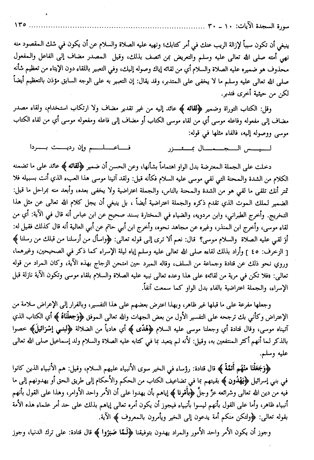 أو لقي عليه الصلاة والسلام موسى؟ قال: نعم ألا ترى إلى قوله تعالى: وَسْئَلْ مَنْ أَرْسَلْنا مِنْ قَبْلِكَ مِنْ رُسُلِنا [الزخرف: 45] وأراد بذلك لقاءه صلّى الله تعالى عليه وسلم إياه ليلة الإسراء كما ذكر في الصحيحين، وغيرهما، وروي نحو ذلك عن قتادة وجماعة من السلف، وقاله المبرد حين امتحن الزجاج بهذه الآية، وكان المراد من قوله تعالى: «فلا تكن في مرية من لقائه» على هذا وعده تعالى نبيه عليه الصلاة والسلام بلقاء موسى وتكون الآية نازلة قبل الإسراء، والجملة اعتراضية بالفاء بدل الواو كما سمعت آنفا.