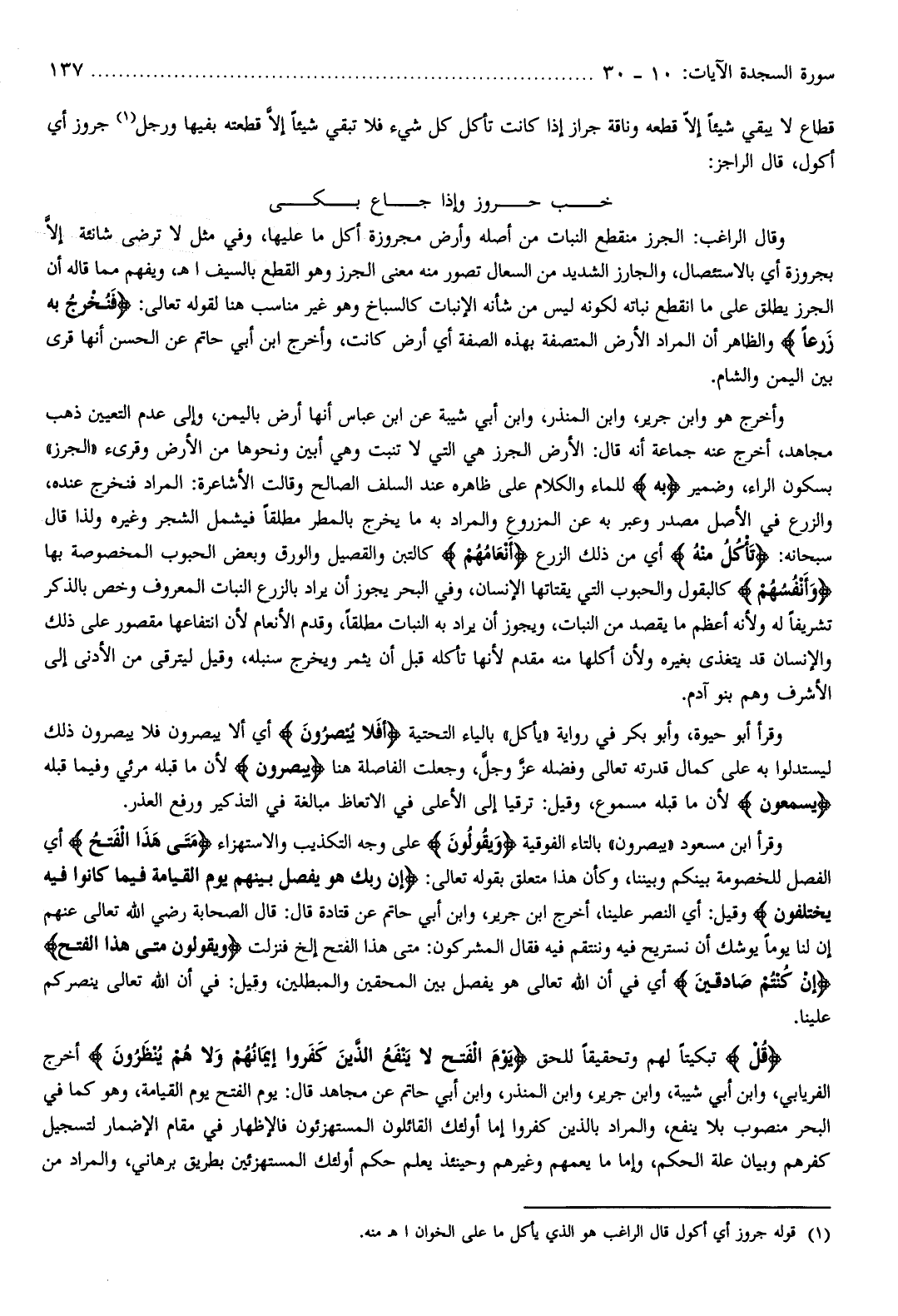 وأخرج هو وابن جرير، وابن المنذر، وابن أبي شيبة عن ابن عباس أنها أرض باليمن، وإلى عدم التعيين ذهب مجاهد، أخرج عنه جماعة أنه قال: الأرض الجرز هي التي لا تنبت وهي أبين ونحوها من الأرض وقرىء «الجرز» بسكون الراء، وضمير بِهِ للماء والكلام على ظاهره عند السلف الصالح وقالت الأشاعرة: المراد فنخرج عنده، والزرع في الأصل مصدر وعبر به عن المزروع والمراد به ما يخرج بالمطر مطلقا فيشمل الشجر وغيره ولذا قال سبحانه: تَأْكُلُ مِنْهُ أي من ذلك الزرع أَنْعامُهُمْ كالتبن والقصيل والورق وبعض الحبوب المخصوصة بها وَأَنْفُسُهُمْ كالبقول والحبوب التي يقتاتها الإنسان، وفي البحر يجوز أن يراد بالزرع النبات المعروف وخص بالذكر تشريفا له ولأنه أعظم ما يقصد من النبات، ويجوز أن يراد به النبات مطلقا، وقدم الأنعام لأن انتفاعها مقصور على ذلك والإنسان قد يتغذى بغيره ولأن أكلها منه مقدم لأنها تأكله قبل أن يثمر ويخرج سنبله، وقيل ليترقى من الأدنى إلى الأشرف وهم بنو آدم.