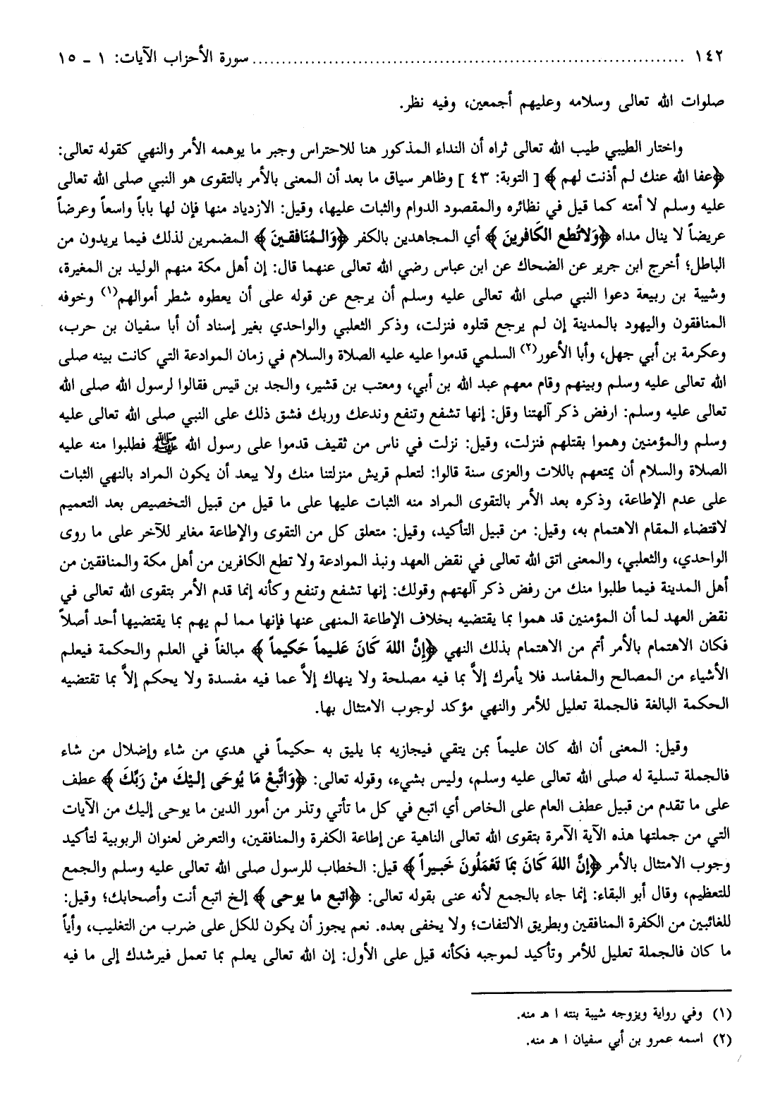 عَفَا اللَّهُ عَنْكَ لِمَ أَذِنْتَ لَهُمْ [التوبة: 43] وظاهر سياق ما بعد أن المعنى بالأمر بالتقوى هو النبي صلّى الله تعالى عليه وسلم لا أمته كما قيل في نظائره والمقصود الدوام والثبات عليها، وقيل: الازدياد منها فإن لها بابا واسعا وعرضا عريضا لا ينال مداه وَلا تُطِعِ الْكافِرِينَ أي المجاهدين بالكفر وَالْمُنافِقِينَ المضمرين لذلك فيما يريدون من الباطل أخرج ابن جرير عن الضحاك عن ابن عباس رضي الله تعالى عنهما قال: إن أهل مكة منهم الوليد بن المغيرة، وشيبة بن ربيعة دعوا النبي صلّى الله تعالى عليه وسلم أن يرجع عن قوله على أن يعطوه شطر أموالهم (¬1) وخوفه المنافقون واليهود بالمدينة إن لم يرجع قتلوه فنزلت، وذكر الثعلبي والواحدي بغير إسناد أن أبا سفيان بن حرب، وعكرمة بن أبي جهل، وأبا الأعور (¬2) السلمي قدموا عليه عليه الصلاة والسلام في زمان الموادعة التي كانت بينه صلّى الله تعالى عليه وسلم وبينهم وقام معهم عبد الله بن أبي، ومعتب بن قشير، والجد بن قيس فقالوا لرسول الله صلّى الله تعالى عليه وسلم: ارفض ذكر آلهتنا وقل: إنها تشفع وتنفع وندعك وربك فشق ذلك على النبي صلّى الله تعالى عليه وسلم والمؤمنين وهموا بقتلهم فنزلت، وقيل: نزلت في ناس من ثقيف قدموا على رسول الله صلّى الله عليه وسلم فطلبوا منه عليه الصلاة والسلام أن يمتعهم باللات والعزى سنة قالوا: لتعلم قريش منزلتنا منك ولا يبعد أن يكون المراد بالنهي الثبات على عدم الإطاعة، وذكره بعد الأمر بالتقوى المراد منه الثبات عليها على ما قيل من قبيل التخصيص بعد التعميم لاقتضاء المقام الاهتمام به، وقيل: من قبيل التأكيد، وقيل: متعلق كل من التقوى والإطاعة مغاير للآخر على ما روى الواحدي، والثعلبي، والمعنى اتق الله تعالى في نقض العهد ونبذ الموادعة ولا تطع الكافرين من أهل مكة والمنافقين من أهل المدينة فيما طلبوا منك من رفض ذكر آلهتهم وقولك: إنها تشفع وتنفع وكأنه إنما قدم الأمر بتقوى الله تعالى في نقض العهد لما أن المؤمنين قد هموا بما يقتضيه بخلاف الإطاعة المنهي عنها فإنها مما لم يهم بما يقتضيها أحد أصلا فكان الاهتمام بالأمر أتم من الاهتمام بذلك النهي إِنَّ اللَّهَ كانَ عَلِيماً حَكِيماً مبالغا في العلم والحكمة فيعلم الأشياء من المصالح والمفاسد فلا يأمرك إلّا بما فيه مصلحة ولا ينهاك إلّا عما فيه مفسدة ولا يحكم إلّا بما تقتضيه الحكمة البالغة فالجملة تعليل للأمر والنهي مؤكد لوجوب الامتثال بها.