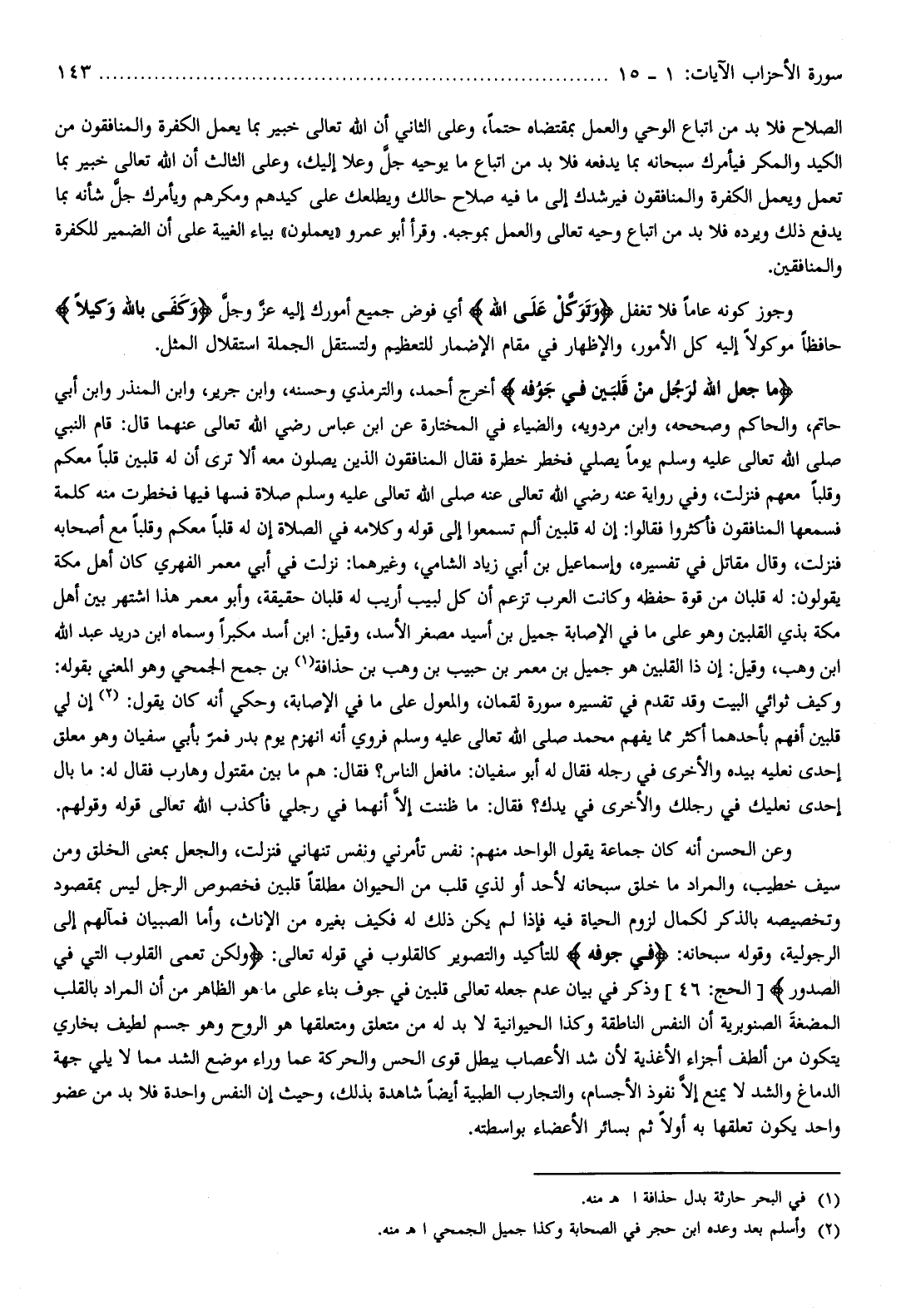 ما جَعَلَ اللَّهُ لِرَجُلٍ مِنْ قَلْبَيْنِ فِي جَوْفِهِ أخرج أحمد، والترمذي وحسنه، وابن جرير، وابن المنذر وابن أبي حاتم، والحاكم وصححه، وابن مردويه، والضياء في المختارة عن ابن عباس رضي الله تعالى عنهما قال: قام النبي صلّى الله تعالى عليه وسلم يوما يصلي فخطر خطرة فقال المنافقون الذين يصلون معه ألا ترى أن له قلبين قلبا معكم وقلبا معهم فنزلت، وفي رواية عنه رضي الله تعالى عنه صلّى الله تعالى عليه وسلم صلاة فسها فيها فخطرت منه كلمة فسمعها المنافقون فأكثروا فقالوا: إن له قلبين ألم تسمعوا إلى قوله وكلامه في الصلاة إن له قلبا معكم وقلبا مع أصحابه فنزلت، وقال مقاتل في تفسيره، وإسماعيل بن أبي زياد الشامي، وغيرهما: نزلت في أبي معمر الفهري كان أهل مكة يقولون: له قلبان من قوة حفظه وكانت العرب تزعم أن كل لبيب أريب له قلبان حقيقة، وأبو معمر هذا اشتهر بين أهل مكة بذي القلبين وهو على ما في الإصابة جميل بن أسيد مصغر الأسد، وقيل: ابن أسد مكبرا وسماه ابن دريد عبد الله ابن وهب، وقيل: إن ذا القلبين هو جميل بن معمر بن حبيب بن وهب بن حذافة (¬1) بن جمح الجمحي وهو المعني بقوله: