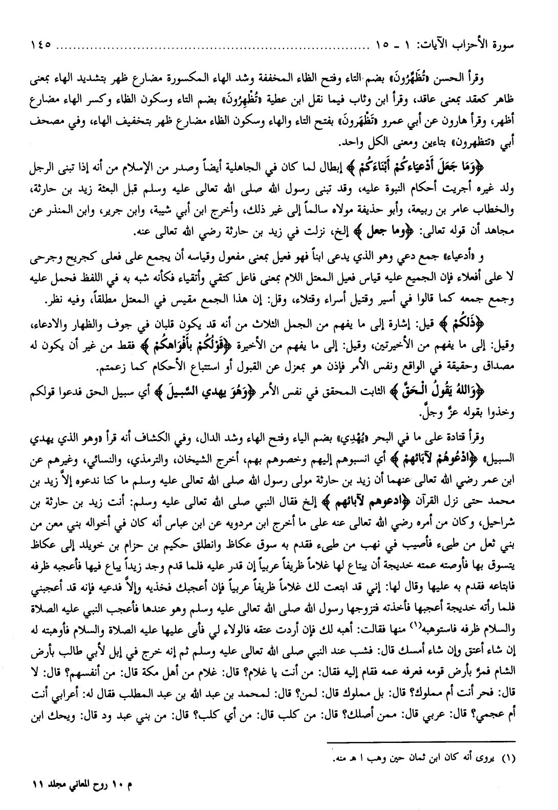 ذلِكُمْ قيل: إشارة إلى ما يفهم من الجمل الثلاث من أنه قد يكون قلبان في جوف والظهار والادعاء، وقيل: إلى ما يفهم من الأخيرتين، وقيل: إلى ما يفهم من الأخيرة قَوْلُكُمْ بِأَفْواهِكُمْ فقط من غير أن يكون له مصداق وحقيقة في الواقع ونفس الأمر فإذن هو بمعزل عن القبول أو استتباع الأحكام كما زعمتم.