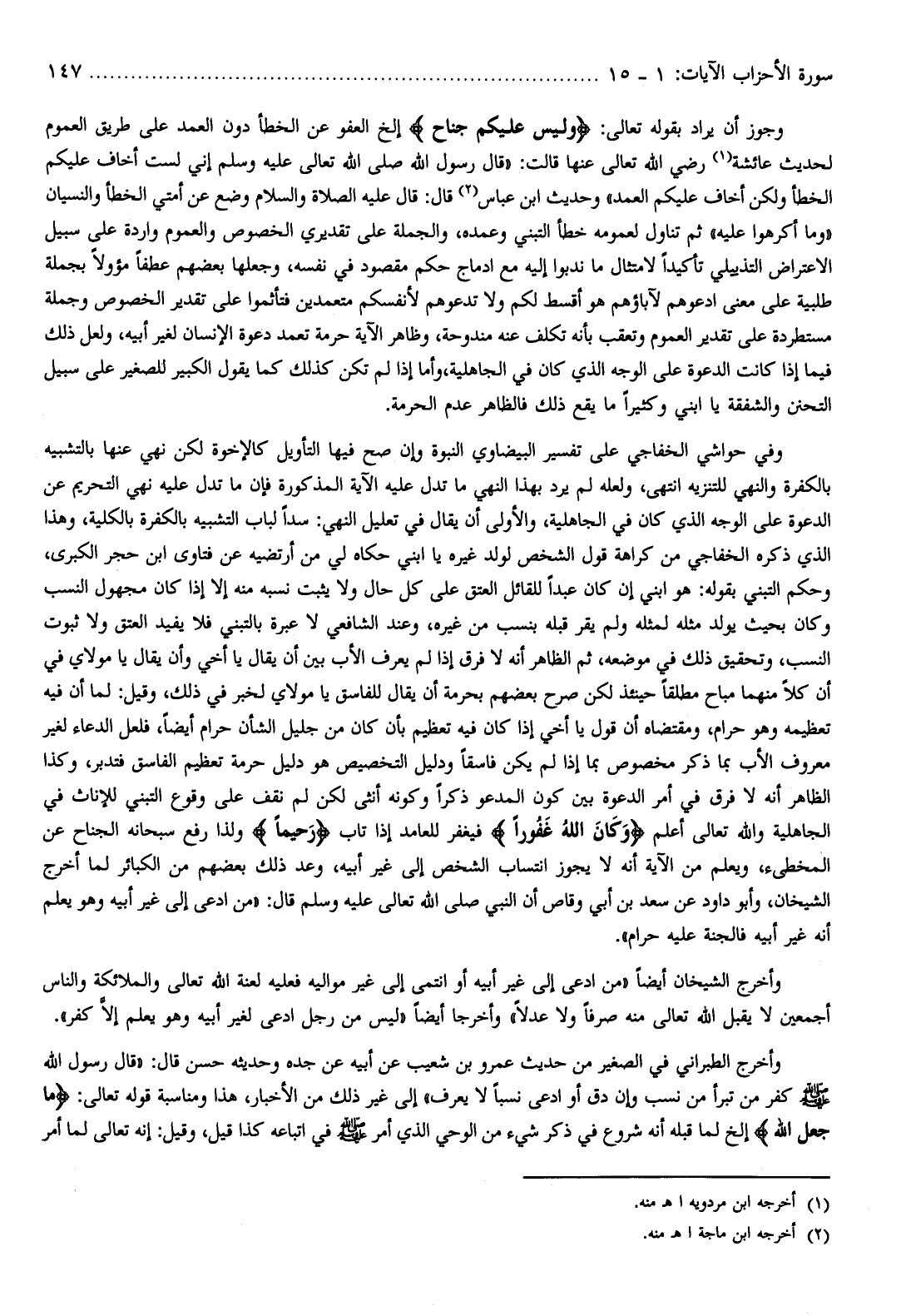 وأخرج الشيخان أيضا «من ادعى إلى غير أبيه أو انتمى إلى غير مواليه فعليه لعنة الله تعالى والملائكة والناس أجمعين لا يقبل الله تعالى منه صرفا ولا عدلا»