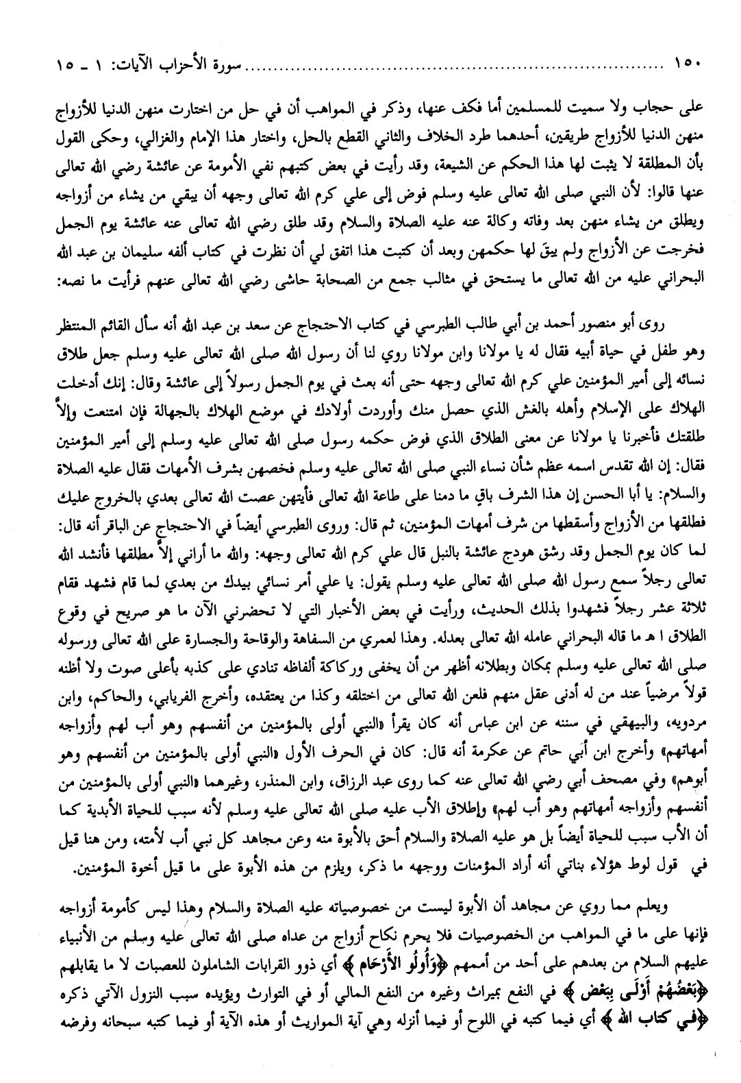 على حجاب ولا سميت للمسلمين أما فكف عنها، وذكر في المواهب أن في حل من اختارت منهن الدنيا للأزواج منهن الدنيا للأزواج طريقين، أحدهما طرد الخلاف والثاني القطع بالحل، واختار هذا الإمام والغزالي، وحكى القول بأن المطلقة لا يثبت لها هذا الحكم عن الشيعة، وقد رأيت في بعض كتبهم نفي الأمومة عن عائشة رضي الله تعالى عنها قالوا: لأن النبي صلّى الله تعالى عليه وسلم فوض إلى علي كرم الله تعالى وجهه أن يبقي من يشاء من أزواجه ويطلق من يشاء منهن بعد وفاته وكالة عنه عليه الصلاة والسلام وقد طلق رضي الله تعالى عنه عائشة يوم الجمل فخرجت عن الأزواج ولم يبق لها حكمهن وبعد أن كتبت هذا اتفق لي أن نظرت في كتاب ألفه سليمان بن عبد الله البحراني عليه من الله تعالى ما يستحق في مثالب جمع من الصحابة حاشى رضي الله تعالى عنهم فرأيت ما نصه:
