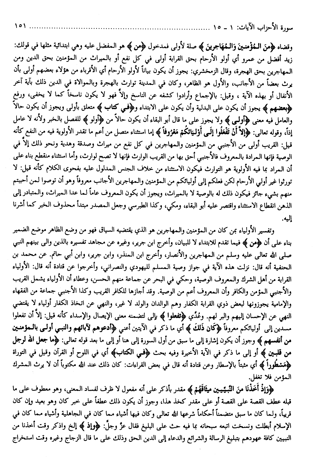 وتفسير الأولياء بمن كان من المؤمنين والمهاجرين هو الذي يقتضيه السياق فهو من وضع الظاهر موضع الضمير بناء على أن مِنْ فيما تقدم للابتداء لا للبيان، وأخرج ابن جرير، وغيره عن مجاهد تفسيره بالذين والى بينهم النبي صلّى الله تعالى عليه وسلم من المهاجرين والأنصار، وأخرج ابن المنذر، وابن جرير، وابن أبي حاتم. عن محمد بن الحنفية أنه قال: نزلت هذه الآية في جواز وصية المسلم لليهودي والنصراني، وأخرجوا عن قتادة أنه قال: الأولياء القرابة من أهل الشرك والمعروف الوصية، وحكي في البحر عن جماعة منهم الحسن، وعطاء أن الأولياء يشمل القريب والأجنبي المؤمن والكافر وأن المعروف أعم من الوصية. وقد أجازها للكافر القريب وكذا الأجنبي جماعة من الفقهاء والإمامية يجوزونها لبعض ذوي القرابة الكفار وهم الوالدان والولد لا غير، والنهي عن اتخاذ الكفار أولياء لا يقتضي النهي عن الإحسان إليهم والبر لهم. وعدّي تَفْعَلُوا بإلى لتضمنه معنى الإيصال والإسداء كأنه قيل: إلّا أن تفعلوا مسدين إلى أوليائكم معروفا كانَ ذلِكَ أي ما ذكر في الآيتين أعني ادْعُوهُمْ لِآبائِهِمْ والنَّبِيُّ أَوْلى بِالْمُؤْمِنِينَ مِنْ أَنْفُسِهِمْ وجوز أن يكون إشارة إلى ما سبق من أول السورة إلى هنا أو إلى ما بعد قوله تعالى: ما جَعَلَ اللَّهُ لِرَجُلٍ مِنْ قَلْبَيْنِ أو إلى ما ذكر في الآية الأخيرة وفيه بحث فِي الْكِتابِ أي في اللوح أو القرآن وقيل في التوراة مَسْطُوراً أي مثبتا بالإسطار وعن قتادة أنه قال في بعض القراءات: كان ذلك عند الله مكتوبا أن لا يرث المشرك المؤمن فلا تغفل.