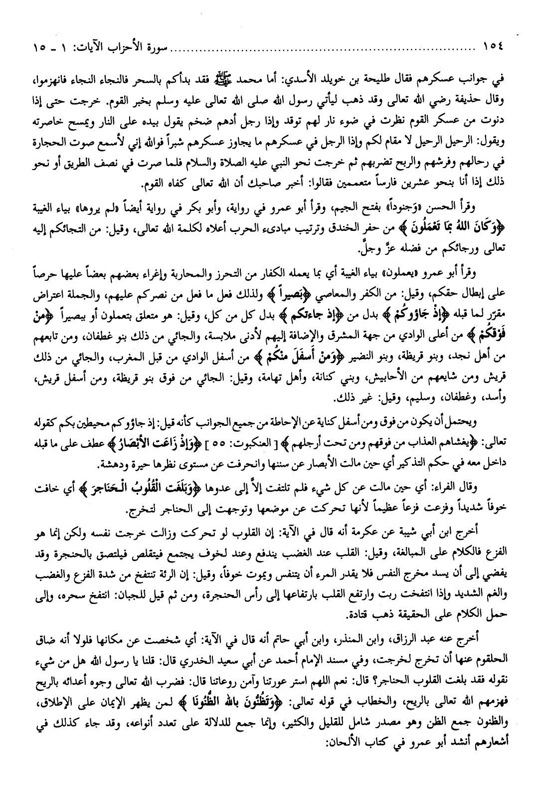 وقرأ أبو عمرو «يعملون» بياء الغيبة أي بما يعمله الكفار من التحرز والمحاربة وإغراء بعضهم بعضا عليها حرصا على إبطال حقكم، وقيل: من الكفر والمعاصي بَصِيراً ولذلك فعل ما فعل من نصركم عليهم، والجملة اعتراض مقرّر لما قبله إِذْ جاؤُكُمْ بدل من إِذْ جاءَتْكُمْ بدل كل من كل، وقيل: هو متعلق بتعملون أو ببصيرا مِنْ فَوْقِكُمْ من أعلى الوادي من جهة المشرق والإضافة إليهم لأدنى ملابسة، والجائي من ذلك بنو غطفان، ومن تابعهم من أهل نجد، وبنو قريظة، وبنو النضير وَمِنْ أَسْفَلَ مِنْكُمْ من أسفل الوادي من قبل المغرب، والجائي من ذلك قريش ومن شايعهم من الأحابيش، وبني كنانة، وأهل تهامة، وقيل: الجائي من فوق بنو قريظة، ومن أسفل قريش، وأسد، وغطفان، وسليم، وقيل: غير ذلك.
