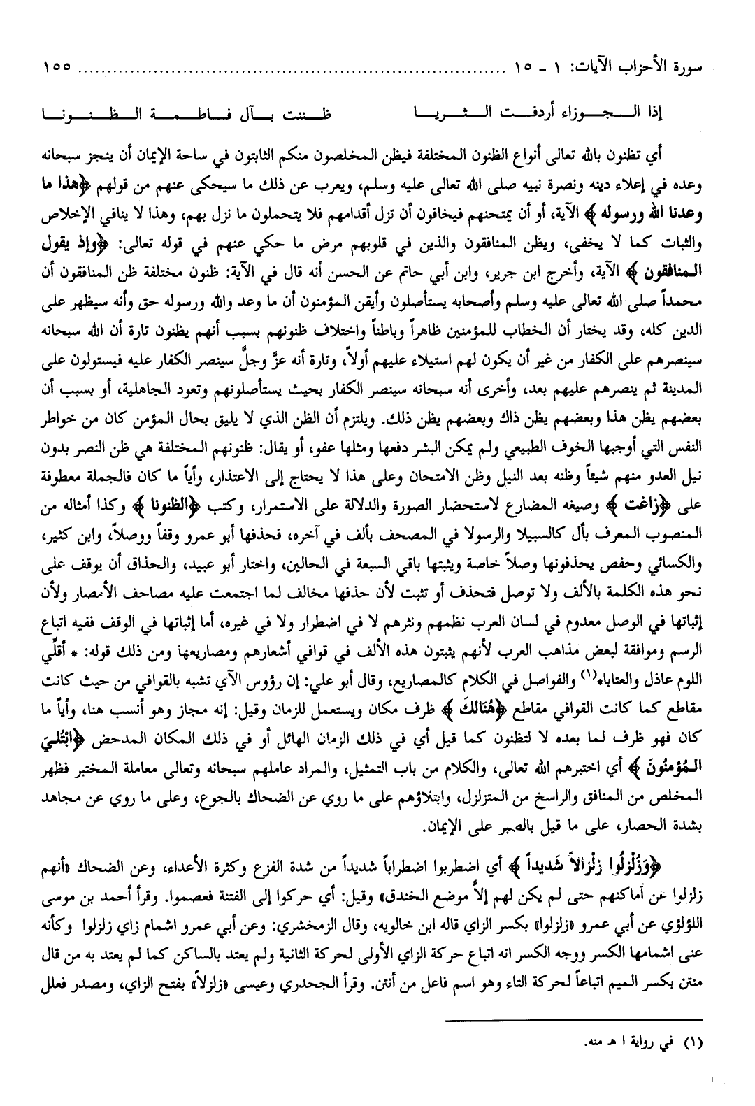 أي تظنون بالله تعالى أنواع الظنون المختلفة فيظن المخلصون منكم الثابتون في ساحة الإيمان أن ينجز سبحانه وعده في إعلاء دينه ونصرة نبيه صلّى الله تعالى عليه وسلم، ويعرب عن ذلك ما سيحكى عنهم من قولهم هذا ما وَعَدَنَا اللَّهُ وَرَسُولُهُ الآية، أو أن يمتحنهم فيخافون أن تزل أقدامهم فلا يتحملون ما نزل بهم، وهذا لا ينافي الإخلاص والثبات كما لا يخفى، ويظن المنافقون والذين في قلوبهم مرض ما حكي عنهم في قوله تعالى: وَإِذْ يَقُولُ الْمُنافِقُونَ الآية، وأخرج ابن جرير، وابن أبي حاتم عن الحسن أنه قال في الآية: ظنون مختلفة ظن المنافقون أن محمدا صلّى الله تعالى عليه وسلم وأصحابه يستأصلون وأيقن المؤمنون أن ما وعد والله ورسوله حق وأنه سيظهر على الدين كله، وقد يختار أن الخطاب للمؤمنين ظاهرا وباطنا واختلاف ظنونهم بسبب أنهم يظنون تارة أن الله سبحانه سينصرهم على الكفار من غير أن يكون لهم استيلاء عليهم أولا، وتارة أنه عزّ وجلّ سينصر الكفار عليه فيستولون على المدينة ثم ينصرهم عليهم بعد، وأخرى أنه سبحانه سينصر الكفار بحيث يستأصلونهم وتعود الجاهلية، أو بسبب أن بعضهم يظن هذا وبعضهم يظن ذاك وبعضهم يظن ذلك. ويلتزم أن الظن الذي لا يليق بحال المؤمن كان من خواطر النفس التي أوجبها الخوف الطبيعي ولم يمكن البشر دفعها ومثلها عفو، أو يقال: ظنونهم المختلفة هي ظن النصر بدون نيل العدو منهم شيئا وظنه بعد النيل وظن الامتحان وعلى هذا لا يحتاج إلى الاعتذار، وأيا ما كان فالجملة معطوفة على زاغَتِ وصيغة المضارع لاستحضار الصورة والدلالة على الاستمرار، وكتب الظُّنُونَا وكذا أمثاله من المنصوب المعرف بأل كالسبيلا والرسولا في المصحف بألف في آخره، فحذفها أبو عمرو وقفا ووصلا، وابن كثير، والكسائي وحفص يحذفونها وصلا خاصة ويثبتها باقي السبعة في الحالين، واختار أبو عبيد، والحذاق أن يوقف على نحو هذه الكلمة بالألف ولا توصل فتحذف أو تثبت لأن حذفها مخالف لما اجتمعت عليه مصاحف الأمصار ولأن إثباتها في الوصل معدوم في لسان العرب نظمهم ونثرهم لا في اضطرار ولا في غيره، أما إثباتها في الوقف ففيه اتباع الرسم وموافقة لبعض مذاهب العرب لأنهم يثبتون هذه الألف في قوافي أشعارهم ومصاريعها ومن ذلك قوله: أقلّي اللوم عاذل والعتابا (¬1) والفواصل في الكلام كالمصاريع، وقال أبو علي: إن رؤوس الآي تشبه بالقوافي من حيث كانت مقاطع كما كانت القوافي مقاطع هُنالِكَ ظرف مكان ويستعمل للزمان وقيل: إنه مجاز وهو أنسب هنا، وأيا ما كان فهو ظرف لما بعده لا لتظنون كما قيل أي في ذلك الزمان الهائل أو في ذلك المكان المدحض ابْتُلِيَ الْمُؤْمِنُونَ أي اختبرهم الله تعالى، والكلام من باب التمثيل، والمراد عاملهم سبحانه وتعالى معاملة المختبر فظهر المخلص من المنافق والراسخ من المتزلزل، وابتلاؤهم على ما روي عن الضحاك بالجوع، وعلى ما روي عن مجاهد بشدة الحصار، على ما قيل بالصبر على الإيمان.