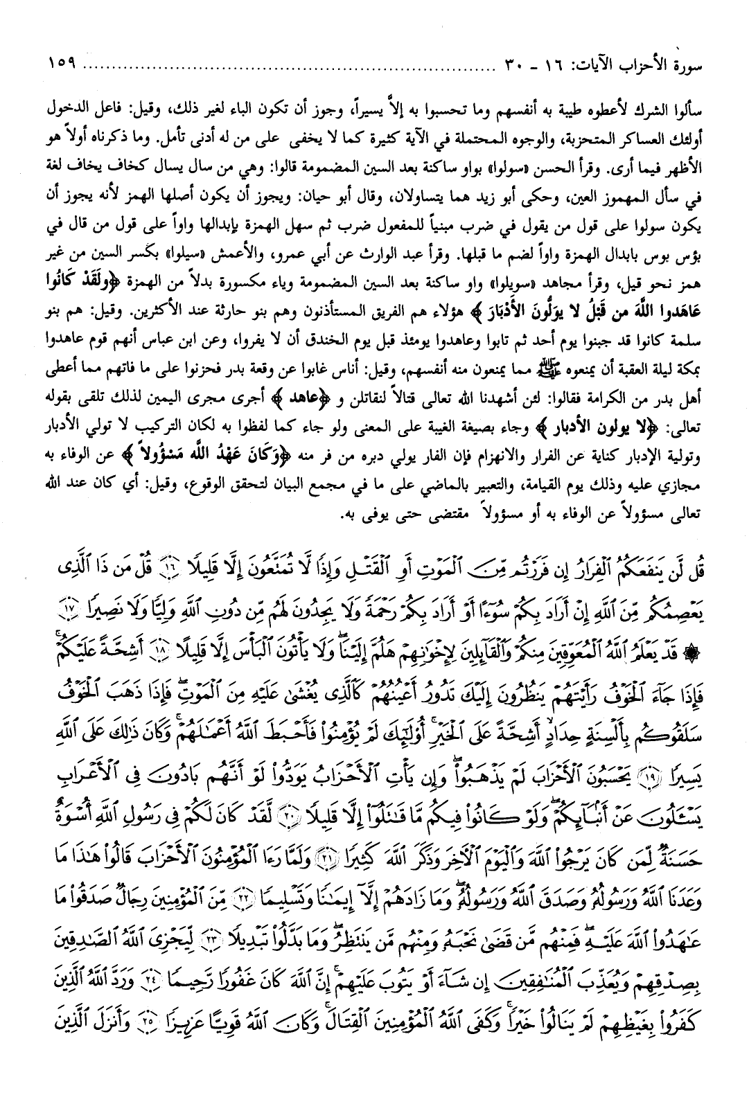 سألوا الشرك لأعطوه طيبة به أنفسهم وما تحسبوا به إلّا يسيرا، وجوز أن تكون الباء لغير ذلك، وقيل: فاعل الدخول أولئك العساكر المتحزبة، والوجوه المحتملة في الآية كثيرة كما لا يخفى على من له أدنى تأمل. وما ذكرناه أولا هو الأظهر فيما أرى. وقرأ الحسن «سولوا» بواو ساكنة بعد السين المضمومة قالوا: وهي من سال يسال كخاف يخاف لغة في سأل المهموز العين، وحكى أبو زيد هما يتساولان، وقال أبو حيان: ويجوز أن يكون أصلها الهمز لأنه يجوز أن يكون سولوا على قول من يقول في ضرب مبنيا للمفعول ضرب ثم سهل الهمزة بإبدالها واوا على قول من قال في بؤس بوس بابدال الهمزة واوا لضم ما قبلها. وقرأ عبد الوارث عن أبي عمرو، والأعمش «سيلوا» بكسر السين من غير همز نحو قيل، وقرأ مجاهد «سويلوا» واو ساكنة بعد السين المضمومة وياء مكسورة بدلا من الهمزة وَلَقَدْ كانُوا عاهَدُوا اللَّهَ مِنْ قَبْلُ لا يُوَلُّونَ الْأَدْبارَ هؤلاء هم الفريق المستأذنون وهم بنو حارثة عند الأكثرين. وقيل: هم بنو سلمة كانوا قد جبنوا يوم أحد ثم تابوا وعاهدوا يومئذ قبل يوم الخندق أن لا يفروا، وعن ابن عباس أنهم قوم عاهدوا بمكة ليلة العقبة أن يمنعوه صلّى الله عليه وسلم مما يمنعون منه أنفسهم، وقيل: أناس غابوا عن وقعة بدر فحزنوا على ما فاتهم مما أعطى أهل بدر من الكرامة فقالوا: لئن أشهدنا الله تعالى قتالا لنقاتلن و (عاهد) أجرى مجرى اليمين لذلك تلقى بقوله تعالى: لا يُوَلُّونَ الْأَدْبارَ وجاء بصيغة الغيبة على المعنى ولو جاء كما لفظوا به لكان التركيب لا تولي الأدبار وتولية الإدبار كناية عن الفرار والانهزام فإن الفار يولي دبره من فر منه وَكانَ عَهْدُ اللَّهِ مَسْؤُلًا عن الوفاء به مجازي عليه وذلك يوم القيامة، والتعبير بالماضي على ما في مجمع البيان لتحقق الوقوع، وقيل: أي كان عند الله تعالى مسؤولا عن الوفاء به أو مسؤولا مقتضى حتى يوفى به.