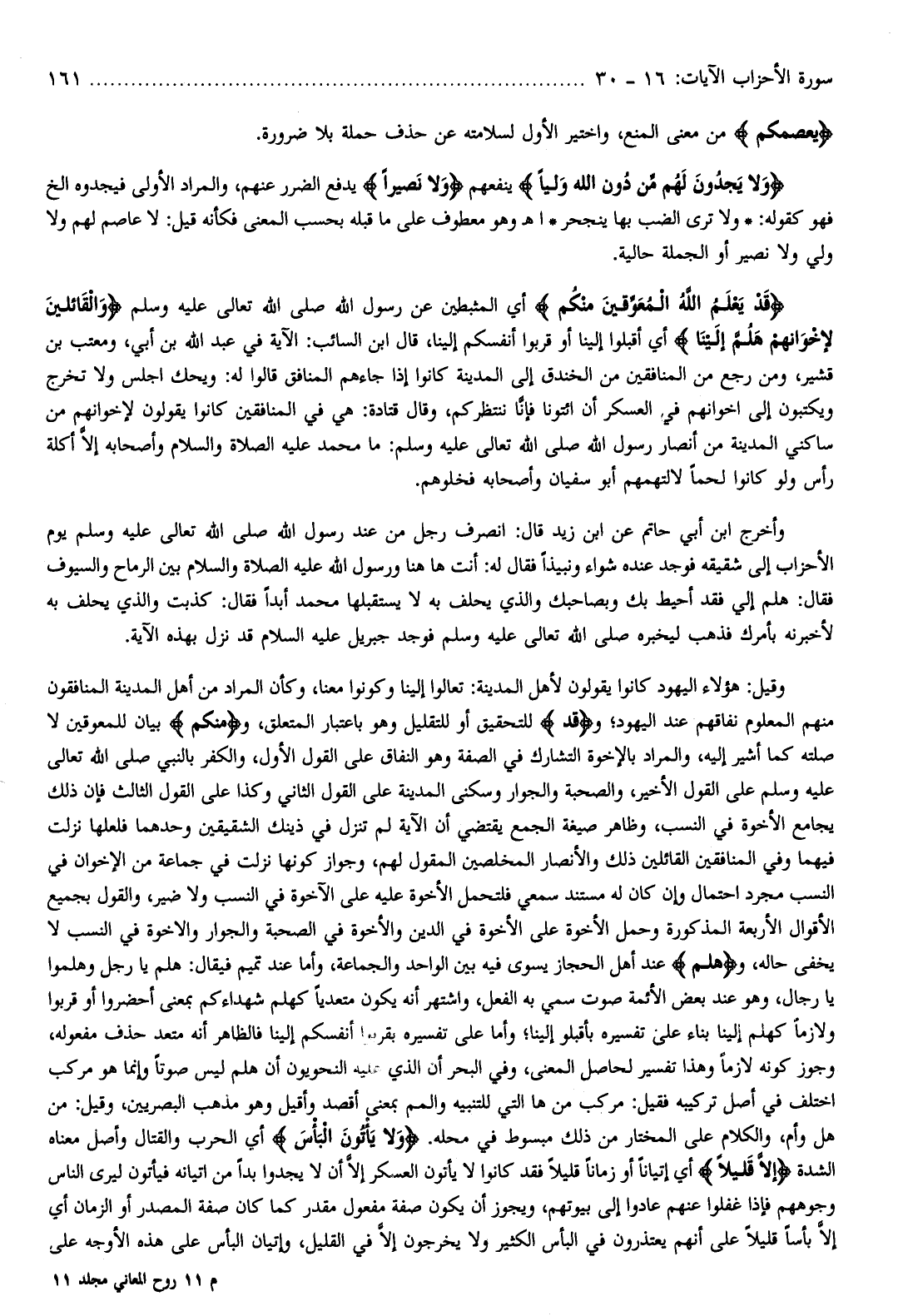 وقيل: هؤلاء اليهود كانوا يقولون لأهل المدينة: تعالوا إلينا وكونوا معنا، وكأن المراد من أهل المدينة المنافقون منهم المعلوم نفاقهم عند اليهود وقَدْ للتحقيق أو للتقليل وهو باعتبار المتعلق، ومِنْكُمْ بيان للمعوقين لا صلته كما أشير إليه، والمراد بالإخوة التشارك في الصفة وهو النفاق على القول الأول، والكفر بالنبي صلّى الله تعالى عليه وسلم على القول الأخير، والصحبة والجوار وسكنى المدينة على القول الثاني وكذا على القول الثالث فإن ذلك يجامع الأخوة في النسب، وظاهر صيغة الجمع يقتضي أن الآية لم تنزل في ذينك الشقيقين وحدهما فلعلها نزلت فيهما وفي المنافقين القائلين ذلك والأنصار المخلصين المقول لهم، وجواز كونها نزلت في جماعة من الإخوان في النسب مجرد احتمال وإن كان له مستند سمعي فلتحمل الأخوة عليه على الأخوة في النسب ولا ضير، والقول بجميع الأقوال الأربعة المذكورة وحمل الأخوة على الأخوة في الدين والأخوة في الصحبة والجوار والأخوة في النسب لا يخفى حاله، وهَلُمَّ عند أهل الحجاز يسوى فيه بين الواحد والجماعة، وأما عند تميم فيقال: هلم يا رجل وهلموا يا رجال، وهو عند بعض الأئمة صوت سمي به الفعل، واشتهر أنه يكون متعديا كهلم شهداءكم بمعنى أحضروا أو قربوا ولازما كهلم إلينا بناء على تفسيره بأقبلو إلينا وأما على تفسيره بقربوا أنفسكم إلينا فالظاهر أنه متعد حذف مفعوله، وجوز كونه لازما وهذا تفسير لحاصل المعنى، وفي البحر أن الذي عليه النحويون أن هلم ليس صوتا وإنما هو مركب اختلف في أصل تركيبه فقيل: مركب من ها التي للتنبيه والمم بمعنى أقصد وأقيل وهو مذهب البصريين، وقيل: من هل وأم، والكلام على المختار من ذلك مبسوط في محله. وَلا يَأْتُونَ الْبَأْسَ أي الحرب والقتال وأصل معناه الشدة إِلَّا قَلِيلًا أي إتيانا أو زمانا قليلا فقد كانوا لا يأتون العسكر إلّا أن لا يجدوا بدا من إتيانه فيأتون ليرى الناس وجوههم فإذا غفلوا عنهم عادوا إلى بيوتهم، ويجوز أن يكون صفة مفعول مقدر كما كان صفة المصدر أو الزمان أي إلّا بأسا قليلا على أنهم يعتذرون في البأس الكثير ولا يخرجون إلّا في القليل، وإتيان البأس على هذه الأوجه على