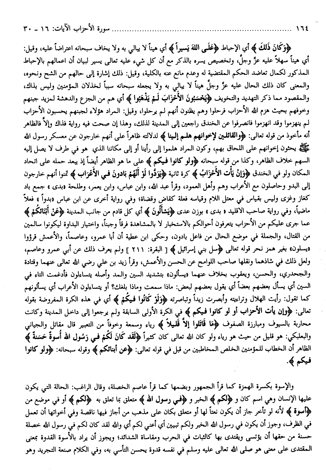 أي هينا سهلا عليه عزّ وجلّ، وتخصيص يسره بالذكر مع أن كل شيء عليه تعالى يسير لبيان أن أعمالهم بالإحباط المذكور لكمال تعاضد الحكم المقتضية له وعدم مانع عنه بالكلية، وقيل: ذلك إشارة إلى حالهم من الشح ونحوه، والمعنى كان ذلك الحال عليه عزّ وجلّ هينا لا يبالي به ولا يجعله سبحانه سببا لخذلان المؤمنين وليس بذاك، والمقصود مما ذكر التهديد والتخويف يَحْسَبُونَ الْأَحْزابَ لَمْ يَذْهَبُوا أي هم من الجزع والدهشة لمزيد جبنهم وخوفهم بحيث هزم الله الأحزاب فرحلوا وهم يظنون أنهم لم يرحلوا، وقيل: المراد هؤلاء لجبنهم يحسبون الأحزاب لم ينهزموا وقد انهزموا فانصرفوا عن الخندق راجعين إلى المدينة لذلك، وهذا إن صحت فيه رواية فذاك وإلّا فالظاهر أنه مأخوذ من قوله تعالى: وَالْقائِلِينَ لِإِخْوانِهِمْ هَلُمَّ إِلَيْنا لدلالته ظاهرا على أنهم خارجون عن معسكر رسول الله صلّى الله عليه وسلم يحثون إخوانهم على اللحاق بهم، وكون المراد هلموا إلى رأينا أو إلى مكاننا الذي هو في طرف لا يصل إليه السهم خلاف الظاهر، وكذا من قوله سبحانه وَلَوْ كانُوا فِيكُمْ على ما هو الظاهر أيضا إذ يبعد حمله على اتحاد المكان ولو في الخندق وَإِنْ يَأْتِ الْأَحْزابُ كرة ثانية يَوَدُّوا لَوْ أَنَّهُمْ بادُونَ فِي الْأَعْرابِ تمنوا أنهم خارجون إلى البدو وحاصلون مع الأعراب وهم وأهل العمود، وقرأ عبد الله، وابن عباس، وابن يعمر، وطلحة «بدى» جمع باد كغاز وغزى وليس بقياس في معتل اللام وقياسه فعلة كقاض وقضاة وفي رواية أخرى عن ابن عباس «بدوا» فعلا ماضيا، وفي رواية صاحب الاقليد «بدى» بوزن عدى يَسْئَلُونَ أي كل قادم من جانب المدينة عَنْ أَنْبائِكُمْ عما جرى عليكم من الأحزاب يتعرفون أحوالكم بالاستخبار لا بالمشاهدة فرقا وجبنا، واختيار البداوة ليكونوا سالمين من القتال، والجملة في موضع الحال من فاعل بادون، وحكى ابن عطية أن أبا عمرو، وعاصما، والأعمش قرؤوا «يسلون» بغير همز نحر قوله تعالى سَلْ بَنِي إِسْرائِيلَ [البقرة: 211] ولم يعرف ذلك عن أبي عمرو وعاصم، ولعل ذلك في شاذهما ونقلها صاحب اللوامح عن الحسن والأعمش، وقرأ زيد بن علي رضي الله تعالى عنهما وقتادة والجحدري، والحسن، ويعقوب بخلاف عنهما «يسألون» بتشديد السين والمد وأصله يتساءلون فأدغمت التاء في السين أي يسأل بعضهم بعضا أي يقول بعضهم لبعض: ماذا سمعت وماذا بلغك؟ أو يتساءلون الأعراب أي يسألونهم كما تقول: رأيت الهلال وتراءيته وأبصرت زيدا وتباصرته وَلَوْ كانُوا فِيكُمْ أي في هذه الكرة المفروضة بقوله تعالى: وَإِنْ يَأْتِ الْأَحْزابُ او لَوْ كانُوا فِيكُمْ في الكرة الأولى السابقة ولم يرجعوا إلى داخل المدينة وكانت محاربة بالسيوف ومبارزة الصفوف ما قاتَلُوا إِلَّا قَلِيلًا رياء وسمعة وخوفا من التعبير قال مقاتل والجياني والبعلبكي: هو قليل من حيث هو رياء ولو كان الله تعالى كان كثيرا لَقَدْ كانَ لَكُمْ فِي رَسُولِ اللَّهِ أُسْوَةٌ حَسَنَةٌ الظاهر أن الخطاب للمؤمنين الخلص المخاطبين من قبل في قوله تعالى: عَنْ أَنْبائِكُمْ وقوله سبحانه: وَلَوْ كانُوا فِيكُمْ.